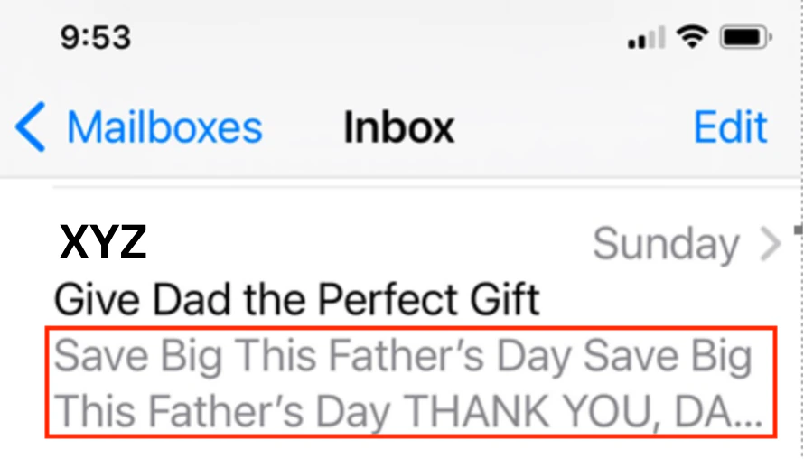 • On an iPhone with iOS 15.8.2, the email preview text is displayed correctly, and the email body does not overlap with the preview text space.