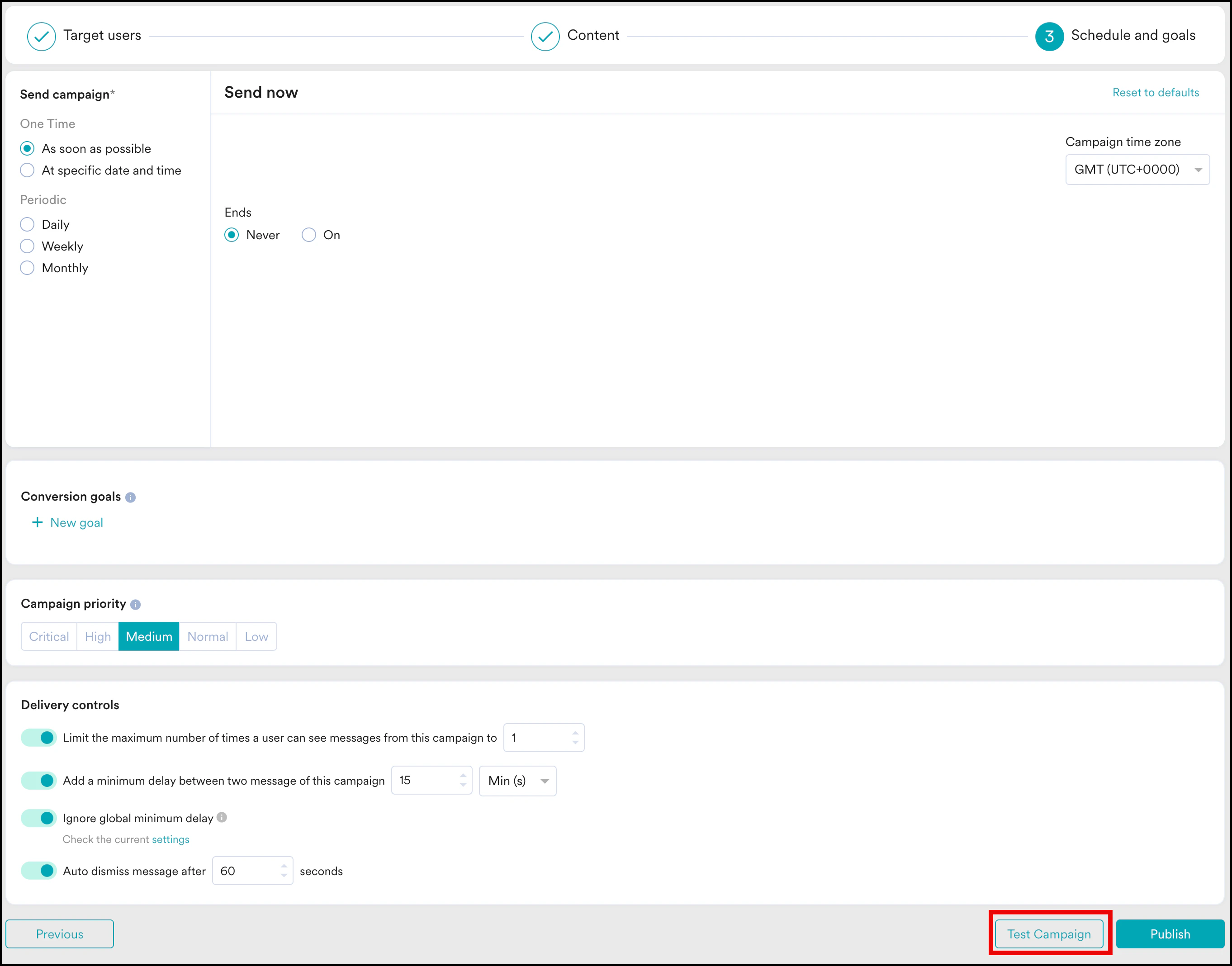 To test your campaign,- On the third step of the campaign creation process, click Test Campaign.