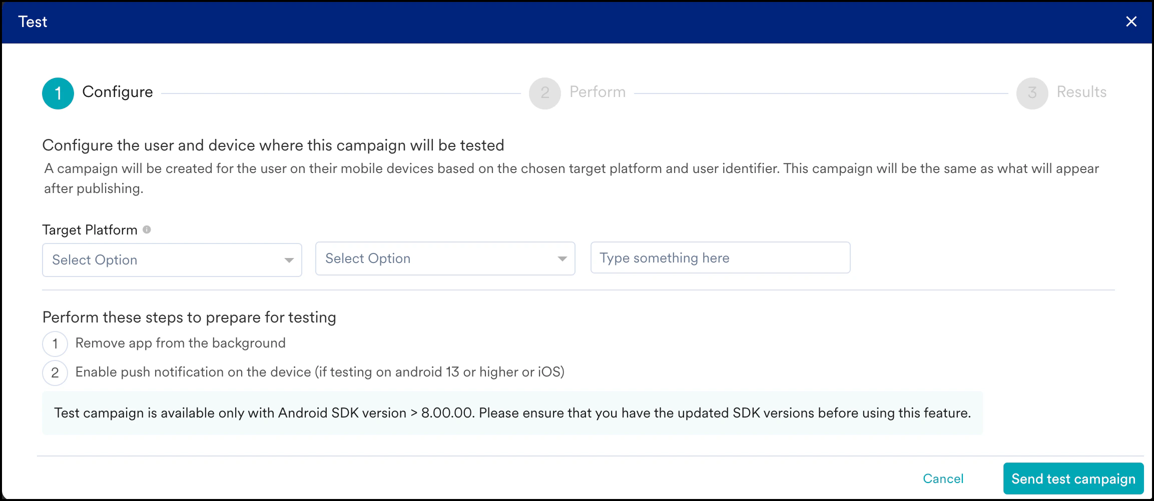 When testing an in-app campaign with a custom trigger event, a step appears: Perform trigger: The trigger you selected To complete this test, perform the custom event you selected in your app. For example, if your campaign is triggered by an “Add to Cart” event, click the Add to Cart button in your app. After you complete the steps, click View Test Results.