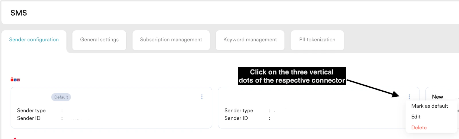 - On the left navigation menu in the MoEngage dashboard, go to Settings > Channels > SMS > Sender configuration.