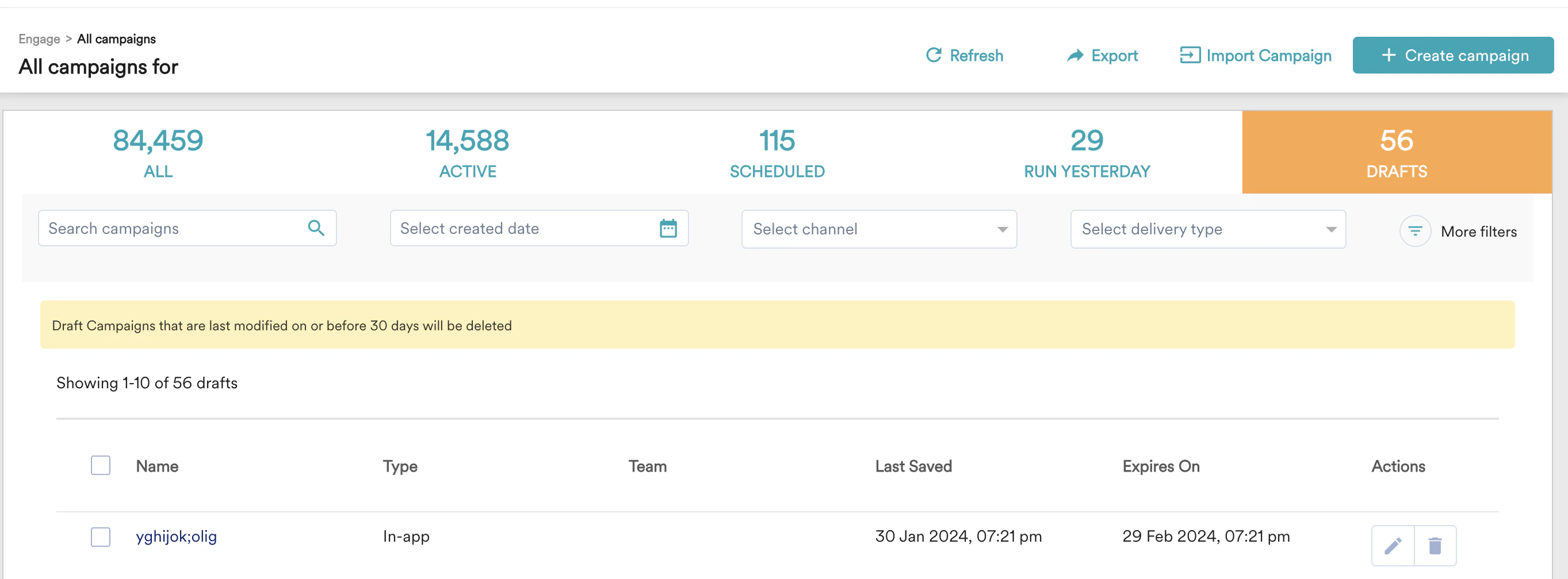 Deleting a campaign permanently removes it from your dashboard. You can only delete campaigns that are in a Draft state. This helps you keep your list of active and completed campaigns clean and organised. To delete a WhatsApp campaign, perform the following steps:- On the MoEngage Dashboard, navigate to Engage > Drafts. You can also find drafts from the All Campaigns page.
