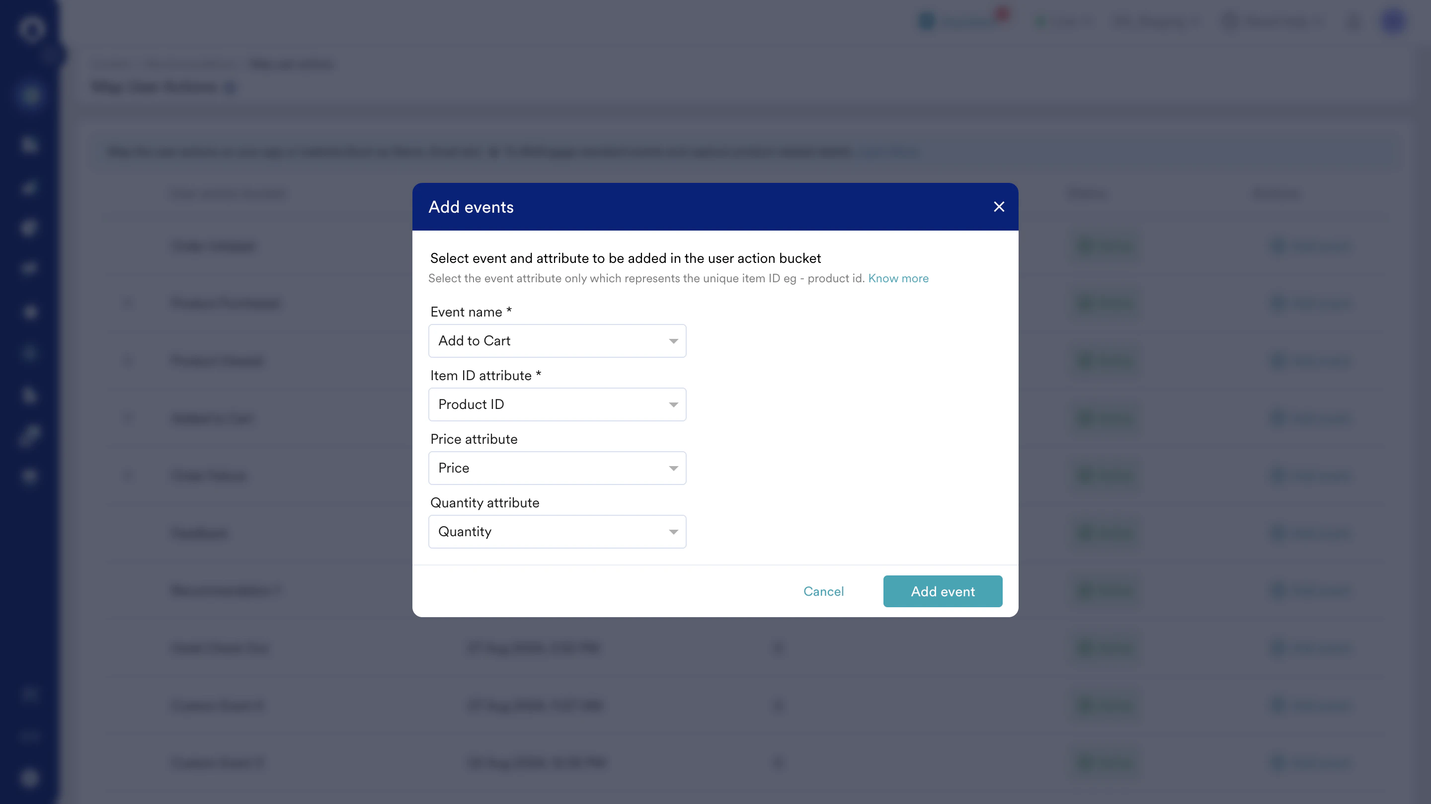 The Map User Action feature allows you to categorize user-item interaction events into standard user events, enabling personalized recommendations based on user engagement. The Map User Action feature acts as a bridge between user engagement events and the attributes of the corresponding items from the catalog.User Activity Events