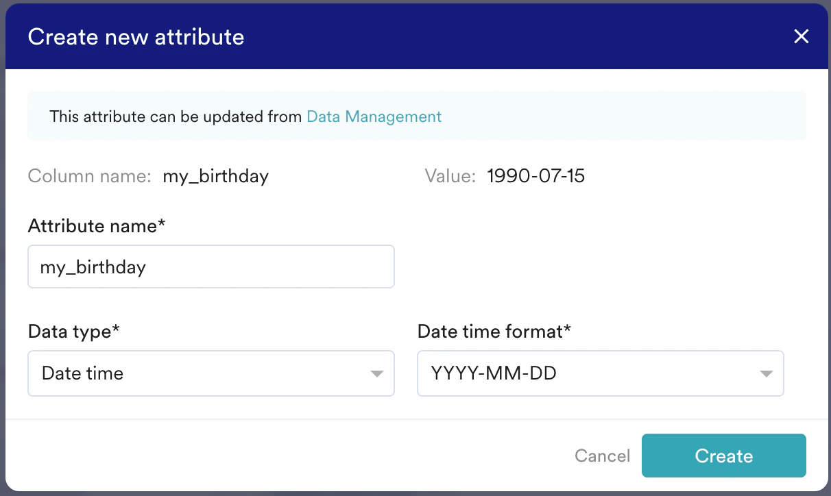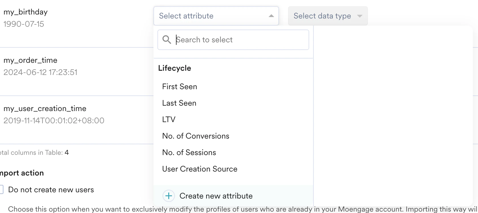 - For each of your datetime attributes, click + Create new attribute from the list to add it as a new attribute in MoEngage.