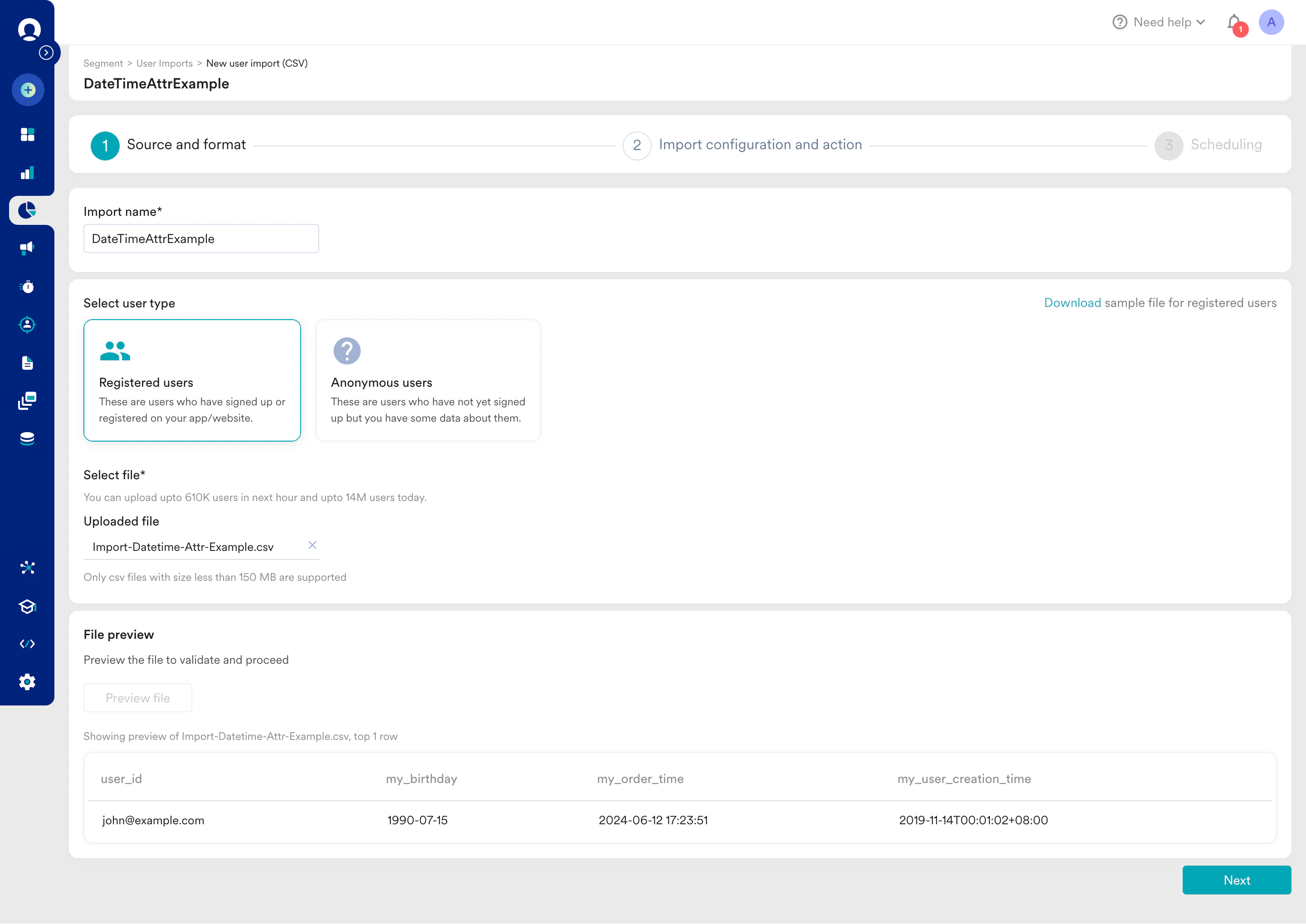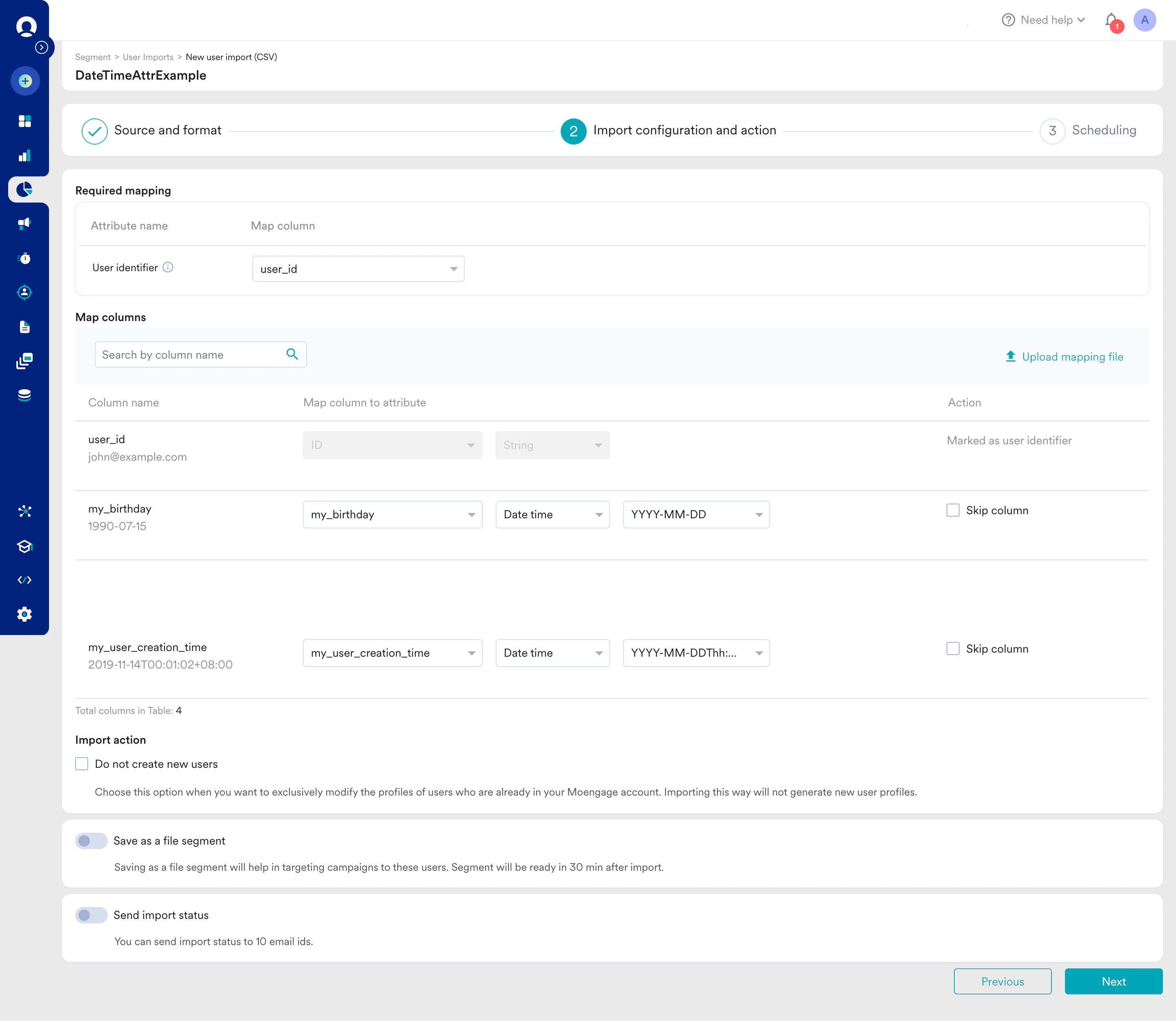 Refer to this document for information on preparing your data according to the expected formats of MoEngage. This section provides the full list of supported datetime formats.Step 2: Upload a Sample File