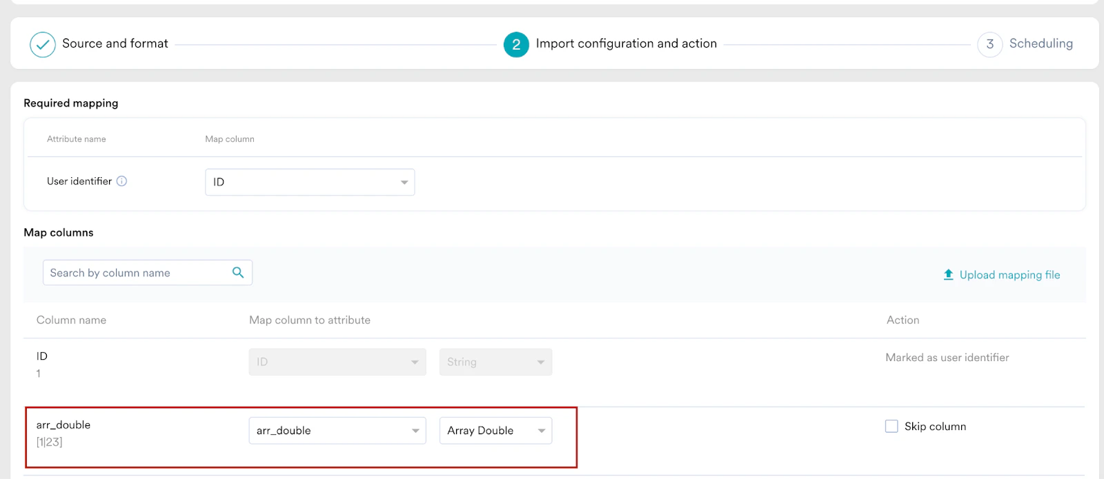 - The supported data types are array double (numeric) and array string. You can select these data types in the list under the Map column to attribute column of the Map columns section while executing Step 2: Import configuration and action.