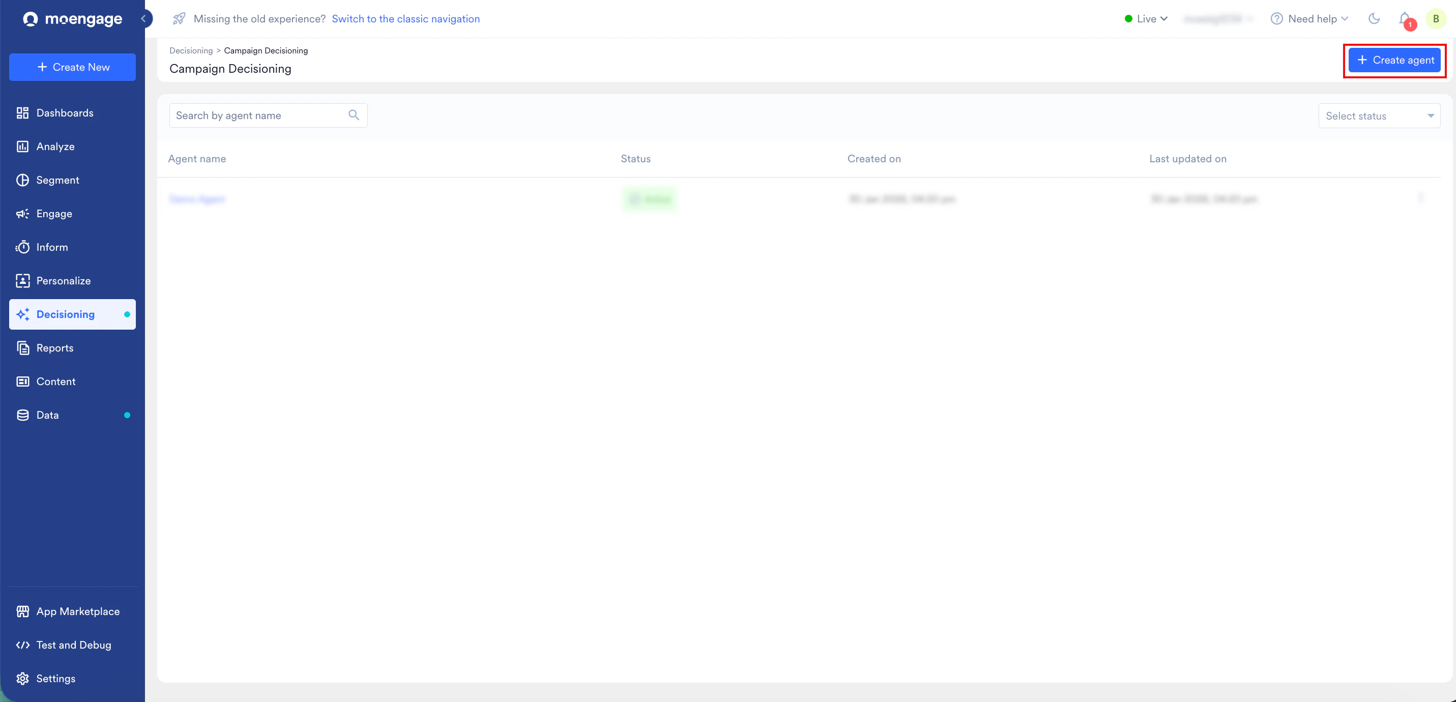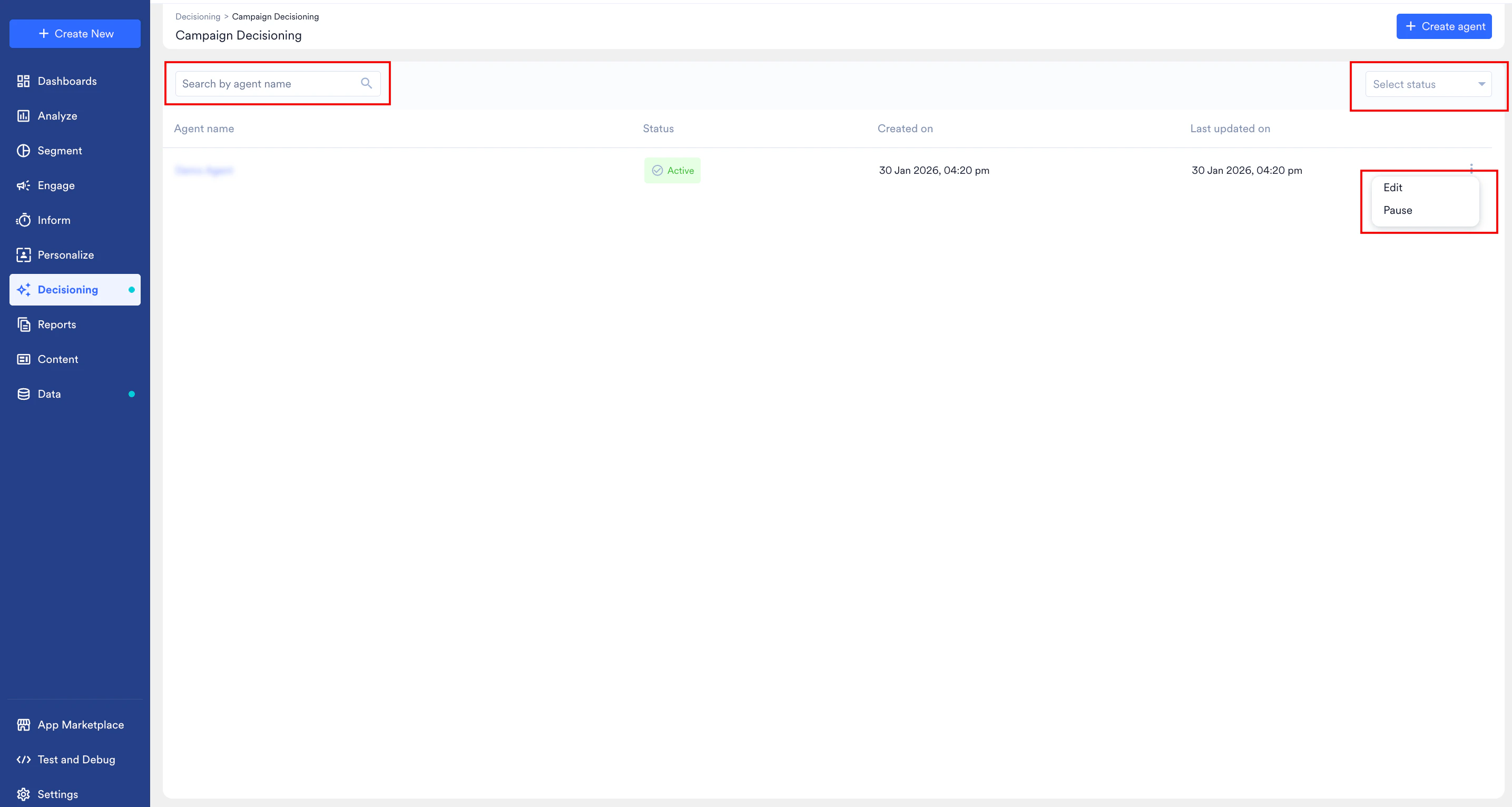 The Campaign Decisioning page lists all agents you have created. After creating the agent, navigate to Decisioning > Campaign Decisioning. On this page, you can:- Search and filter: Use the search by agent name box to find an agent by name or use the Select Status list to filter by Active, Paused, or Stopped.