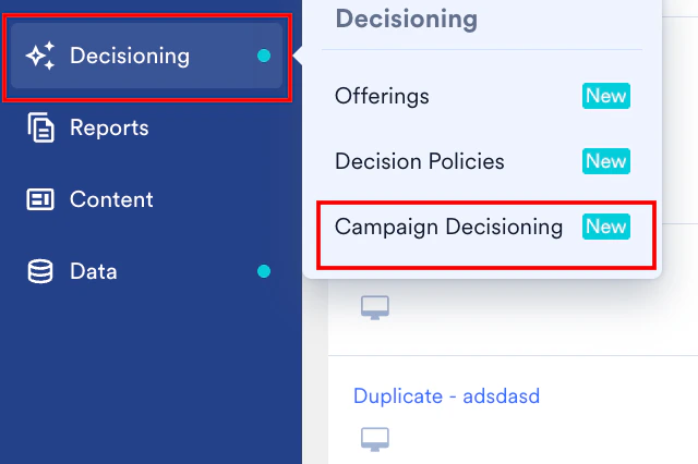 . The Decisioning menu appears. - Click Campaign Decisioning.