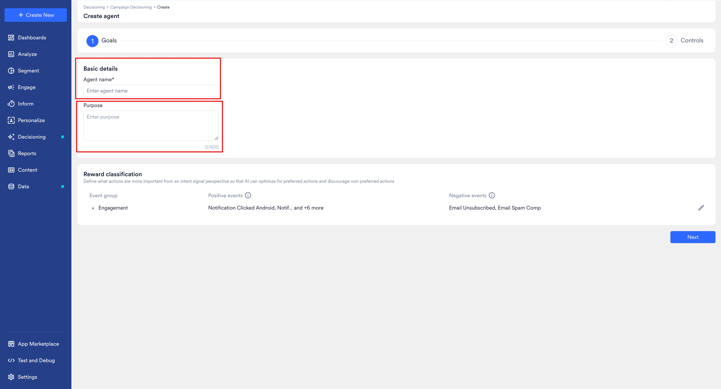 Agent Control Group: Turn this toggle on to set aside a random sample of users (for example, 10%) who will not receive communications. This serves as a baseline to measure the AI’s actual impact.