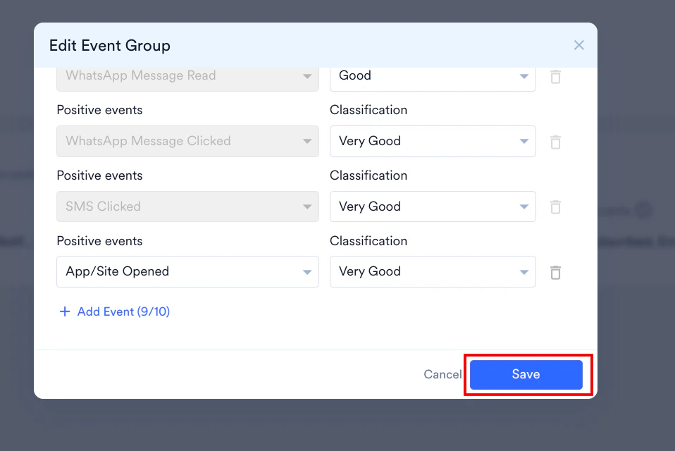 - Add events: Click + Add Event to include additional signals. You can add up to 10 events.