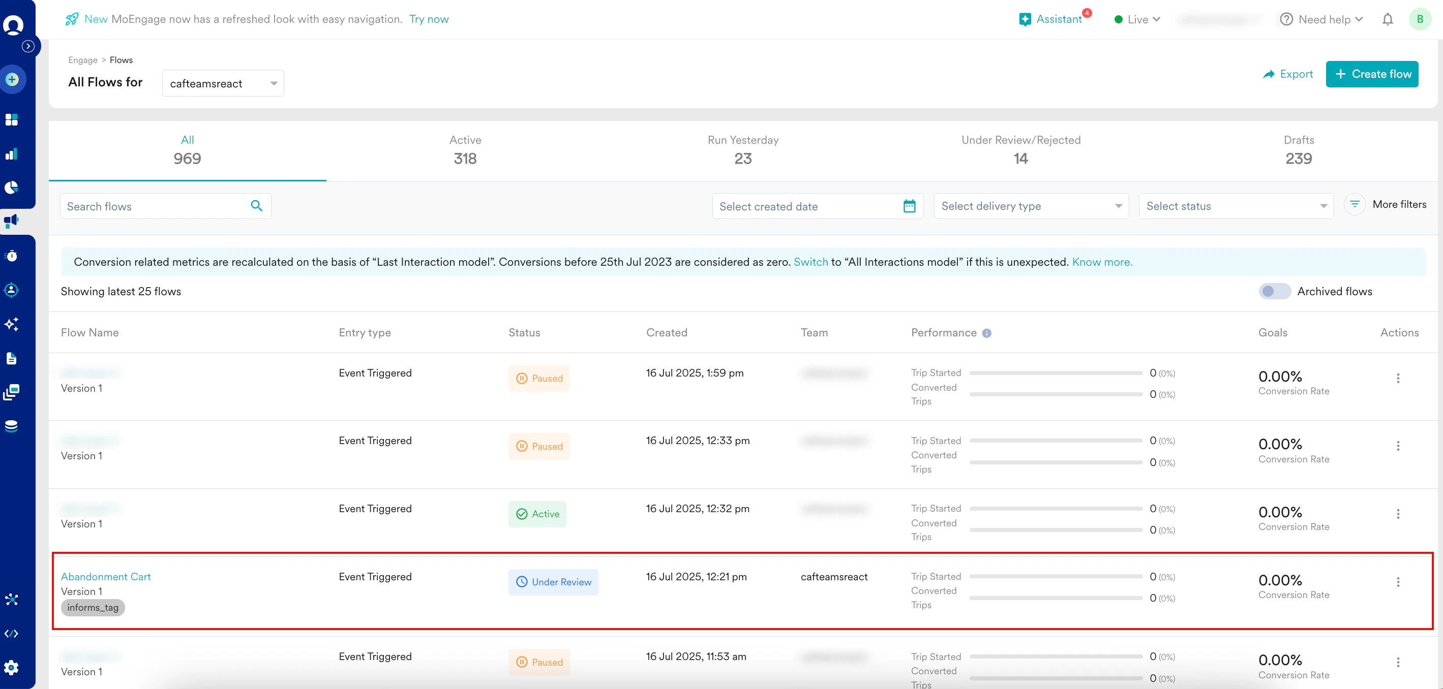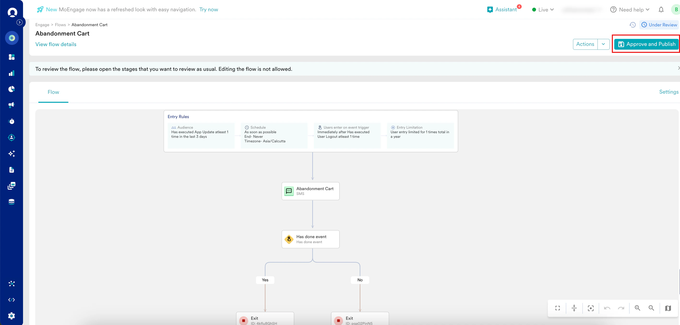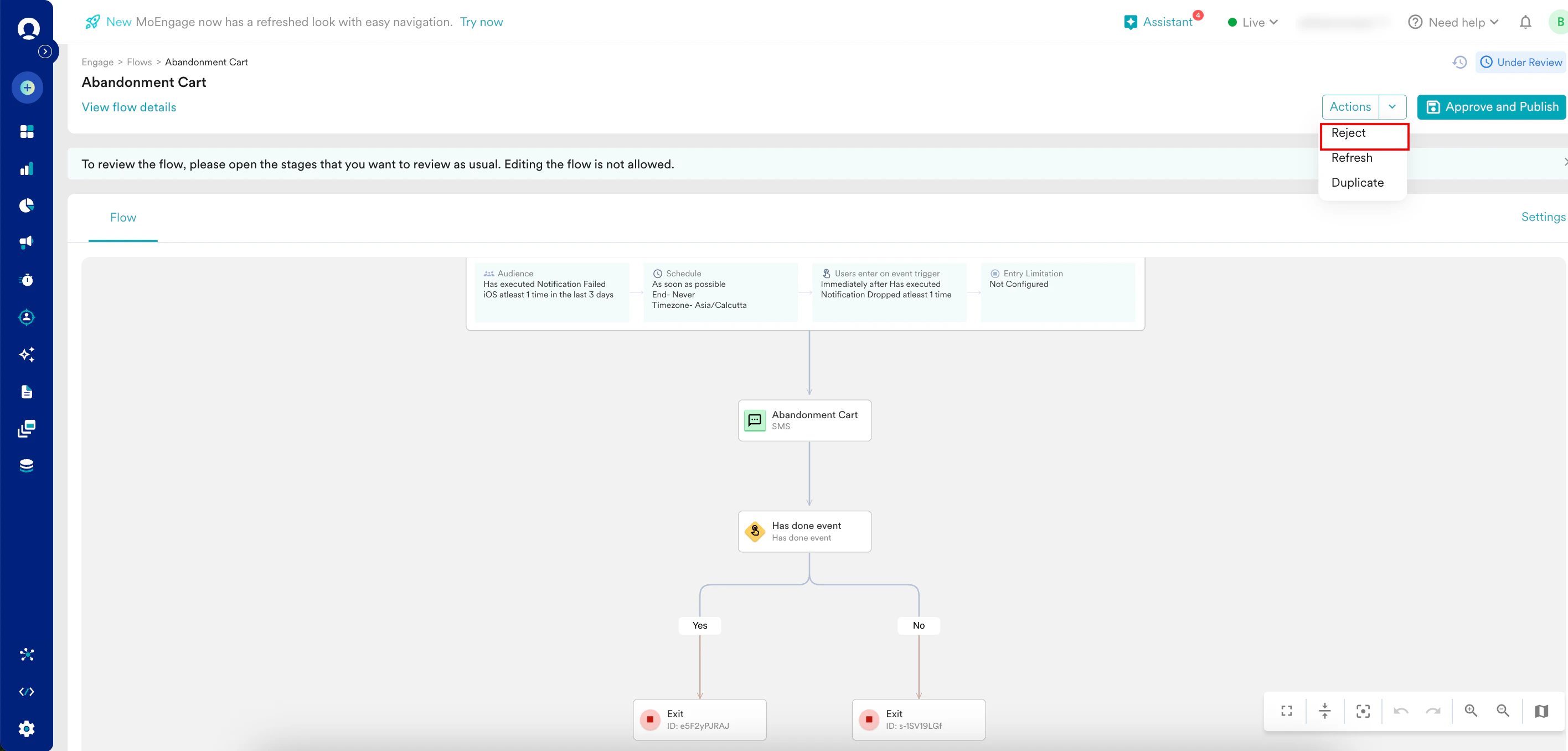 - After making the requested changes, MoEngage can resubmit the flow by following the approval process. For more information, refer here.