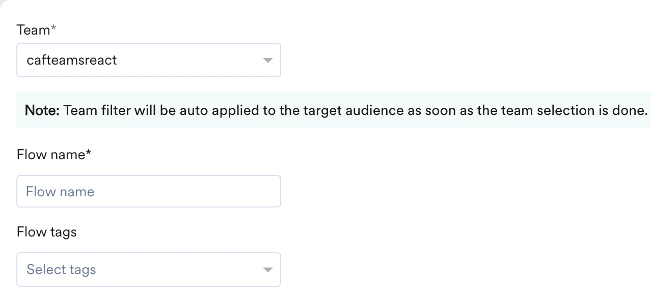The flow details section contains the following fields:| - - Team: If your organization has Team enabled, in the Team list, select your team to associate with the flow. For more information, refer to Teams in MoEngage. - Flow name: Enter the name of the flow to manage and identify the flow. The flow name must have at least five characters, and the limit is 256. The flow name can contain special characters. - Flow tags: Select flow tags from the drop-down list to provide clarity to tags. You can select a maximum of five tags. For more information, refer to Tags in MoEngage. | ![]() |