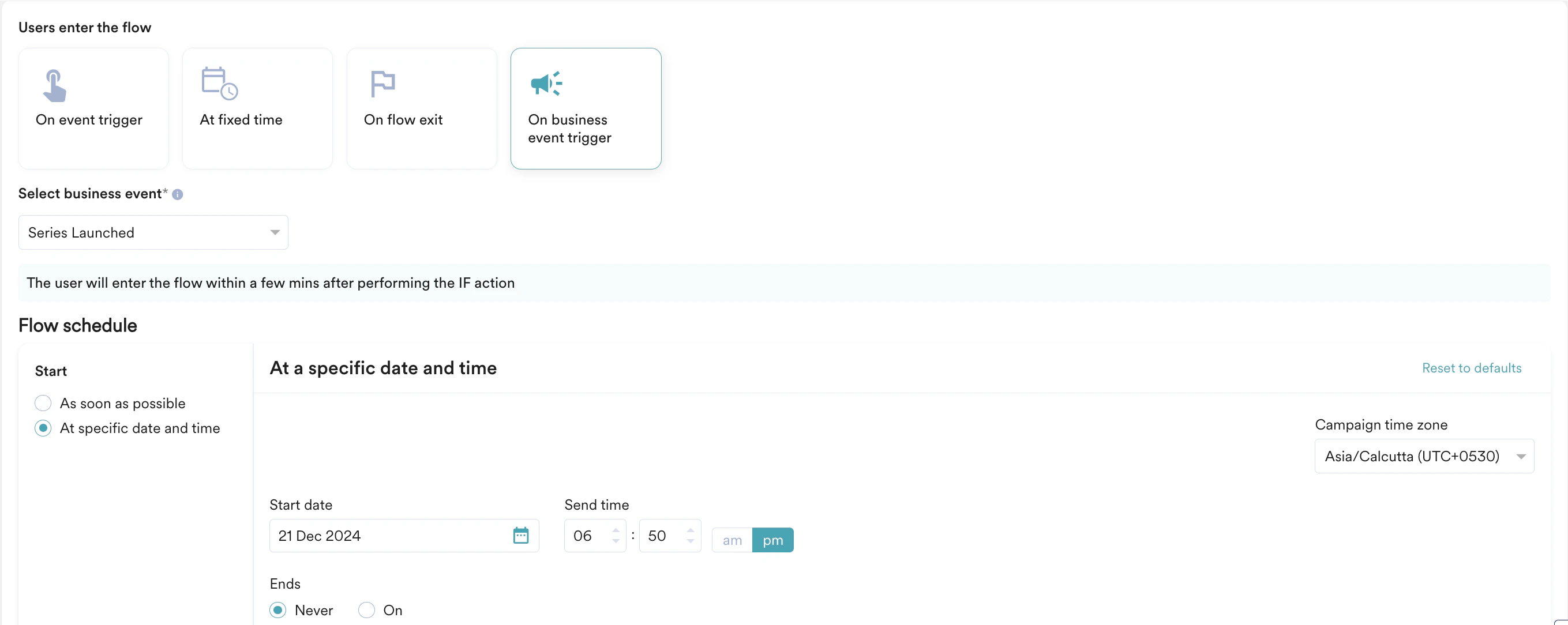| At specific date and time | Triggers the flow at the specified time and time zone. This section helps you send the campaign on a specific date and time and contains the following fields: - Campaign time zone - the timezone in which the flow should start/end. - Start date - the date on which the campaign should be sent. - Send time - the time at which the campaign should be sent. Select am or pm depending on when the time of day at which the campaign should be sent. - Ends: You can choose the end time for the flow by selecting the End option to control when to stop new entries to the Flow. The following options are available: - Never: the flow never ends. - On: the Flow ends on the end date specified in the End date and End time fields. ![]() |