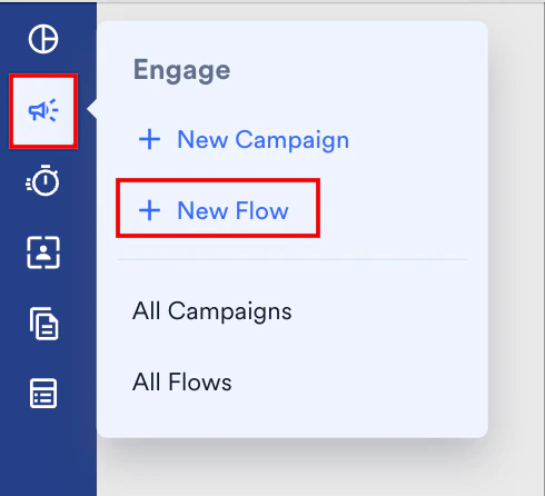 MoEngage Flows is a series of Cross-channel (across the channels such as Email, Push, SMS, and so on) Lifecycle campaigns that will be sent to your customers based on their actions or in-actions on your app or website. To create a flow, perform the following steps:- On the sidebar menu in MoEngage, hover over the Engage menu item