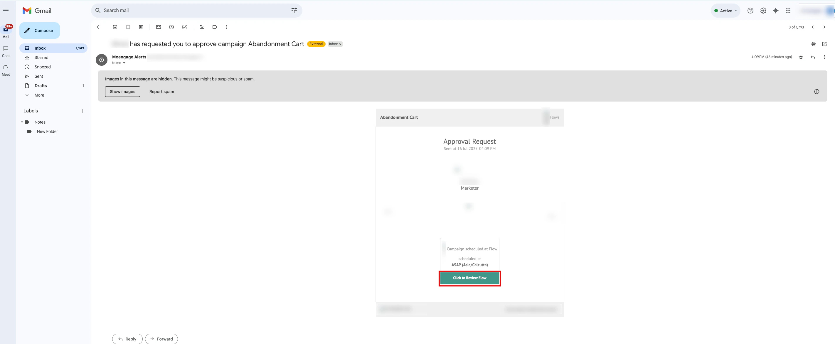 - Open the email you received from MoEngage and click Click to Review Flow.