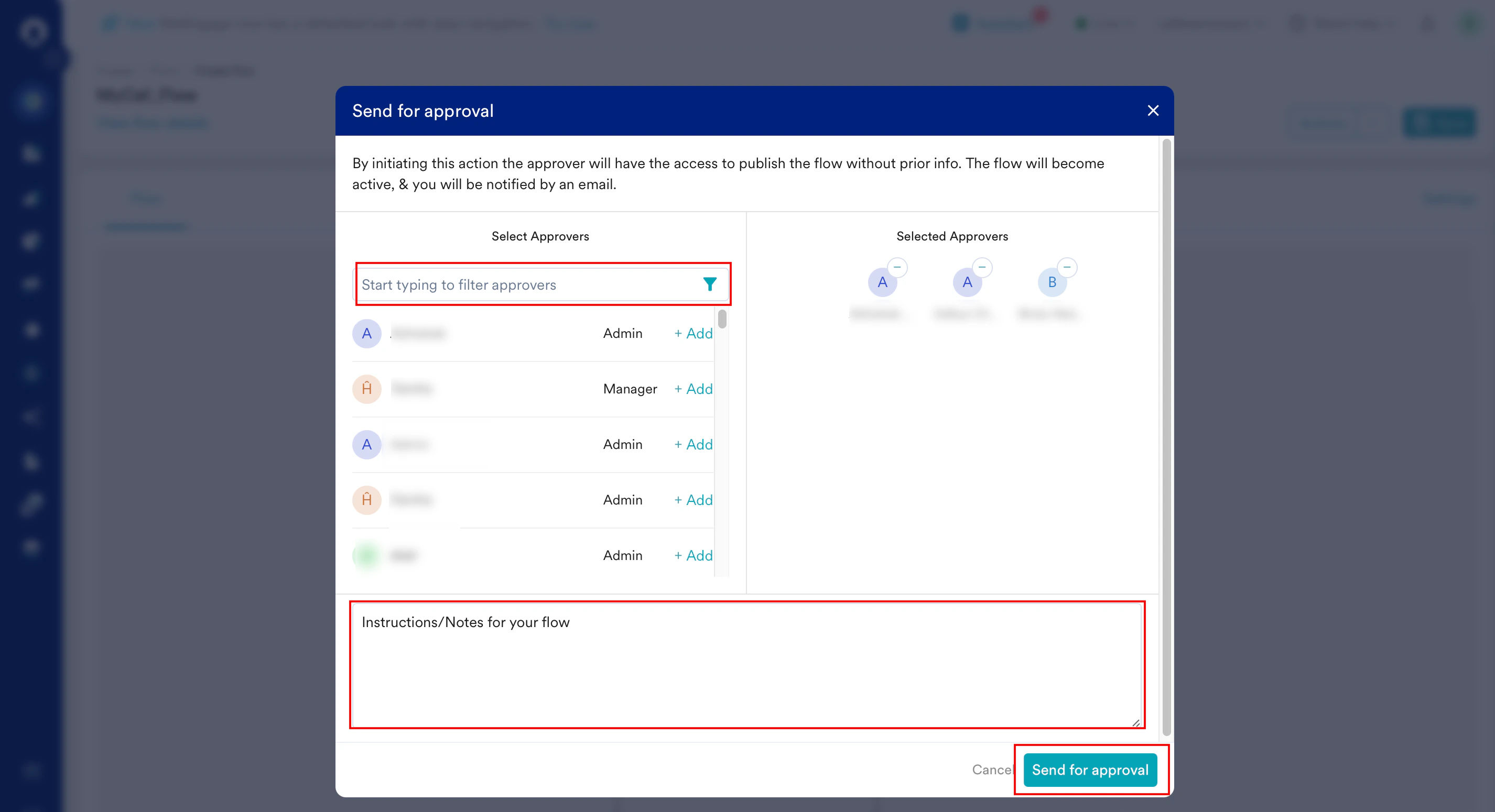 - Click + Add next to the name of each user you want to review the flow. The selected users appear in the Selected Approvers section on the right.