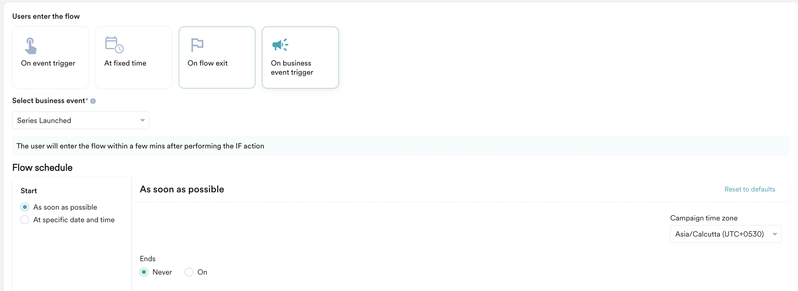 | As soon as possible | Triggers the flow immediately. You can select: - Campaign time zone - the timezone in which the campaign should be sent. - Ends: You can choose the end time for the flow by selecting the End option to control when to stop new entries to the Flow. The following options are available: - Never: the flow never ends. - On: the Flow ends on the end date specified in the End date and End time fields. |