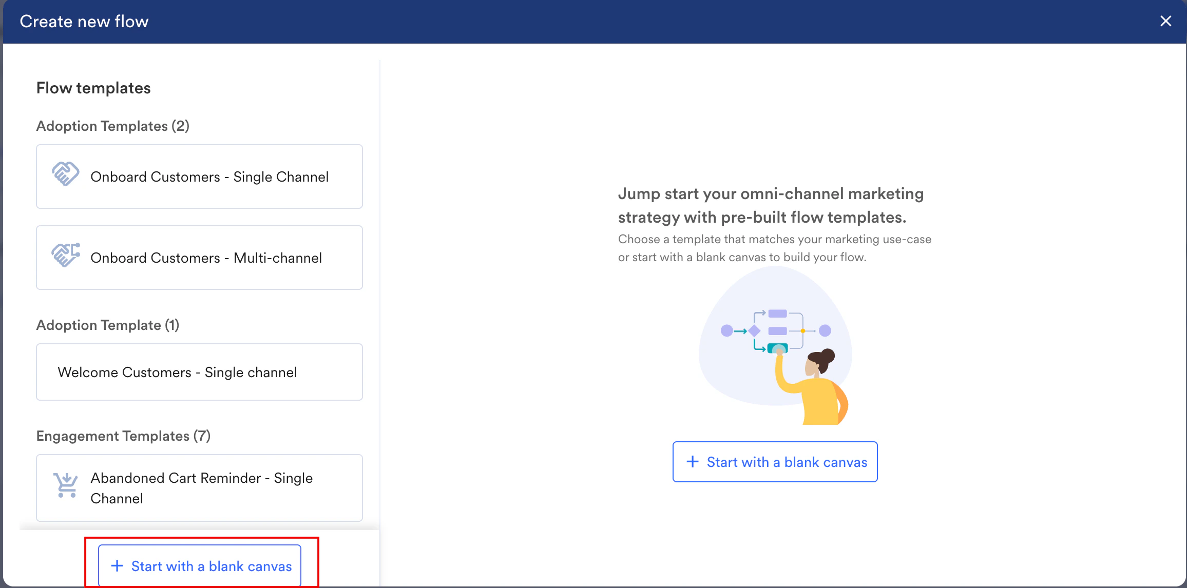 Flow templates provide you with inspiration for crafting your flows based on your goals - onboarding, incentivization, and engagement.You can create single-channel or multiple-channel flows for sending reminders for abandoned carts, reach out to customers who are a churn risk, and improve app/website engagement. The various Flow templates are discussed below :Template Types