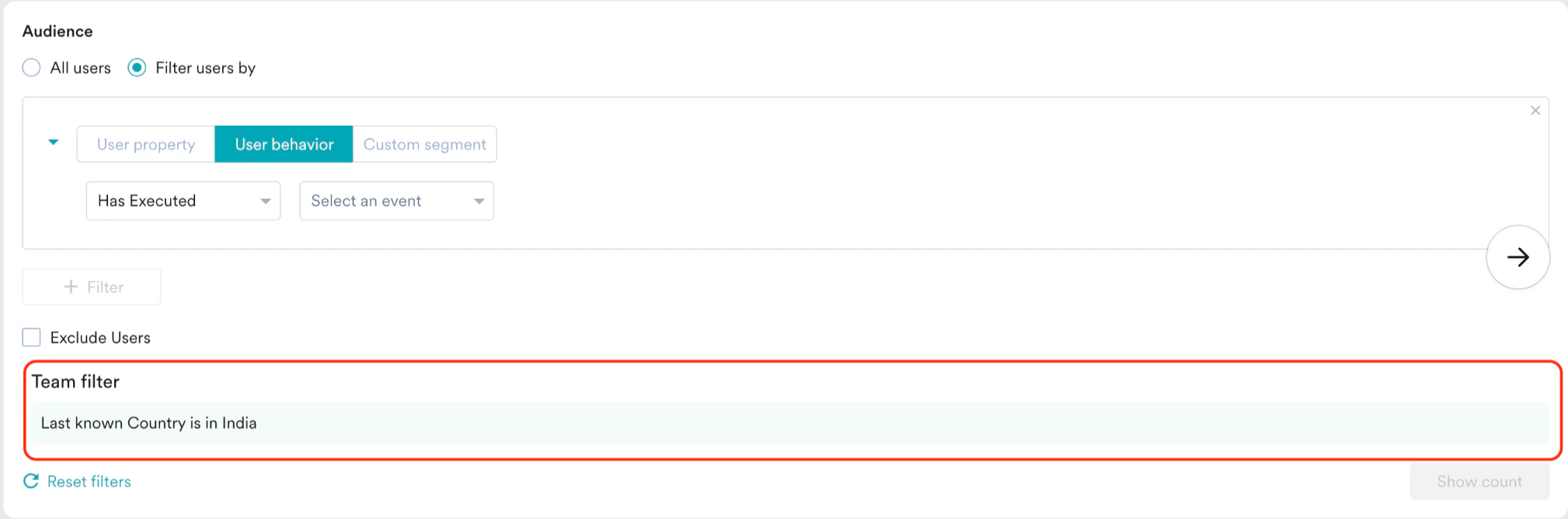 - Show count: Click this button to display the total number of users who are currently in the configured segment.