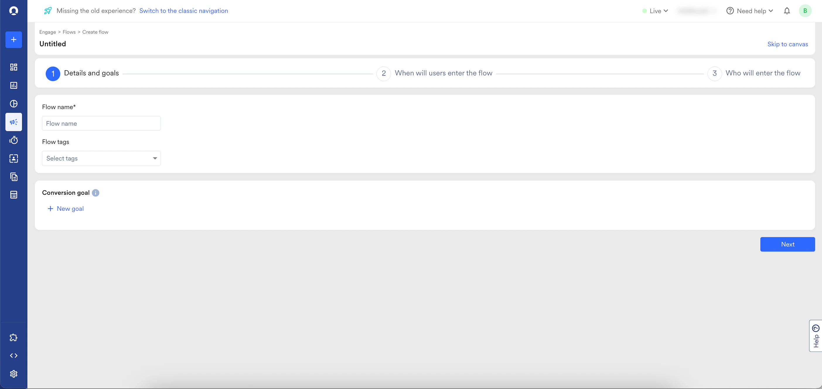 You can also click All Flows on the Engage menu and then click + Create flow on the Flows page. The Create new flow page appears.