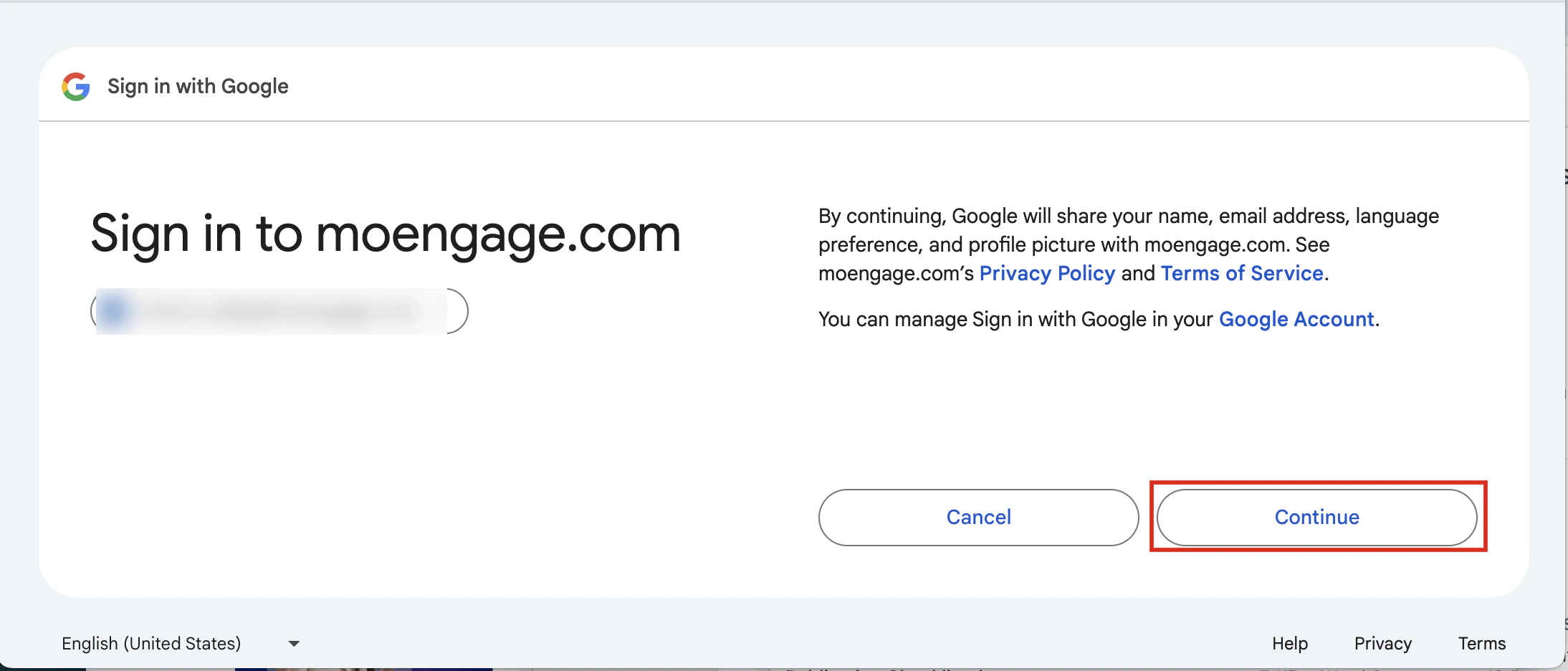 4. On the Sign in to moengage.com page, click Continue. If 2-step verification is not enabled for your account, you are directly logged in to the MoEngage dashboard.