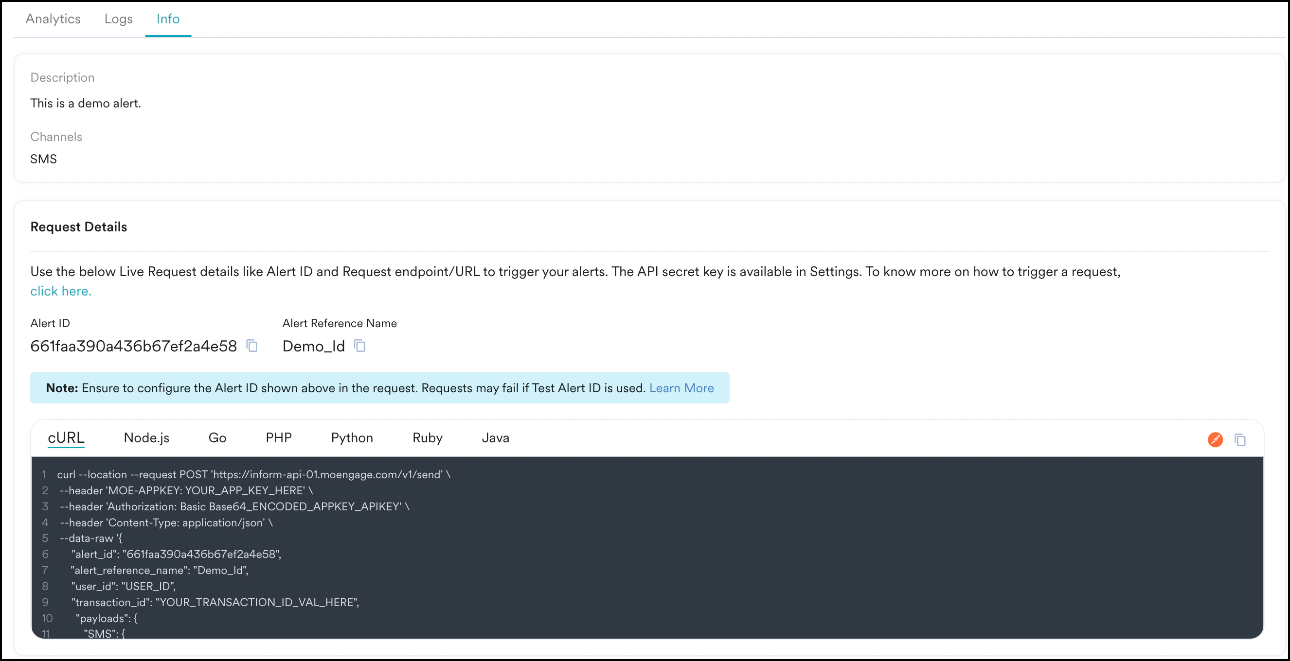 - The Alert ID or Reference ID mentioned above in the code snippets must be used while sending Live Alerts. In case you use the Test Alert ID that is available during Alert creation, the request will fail.