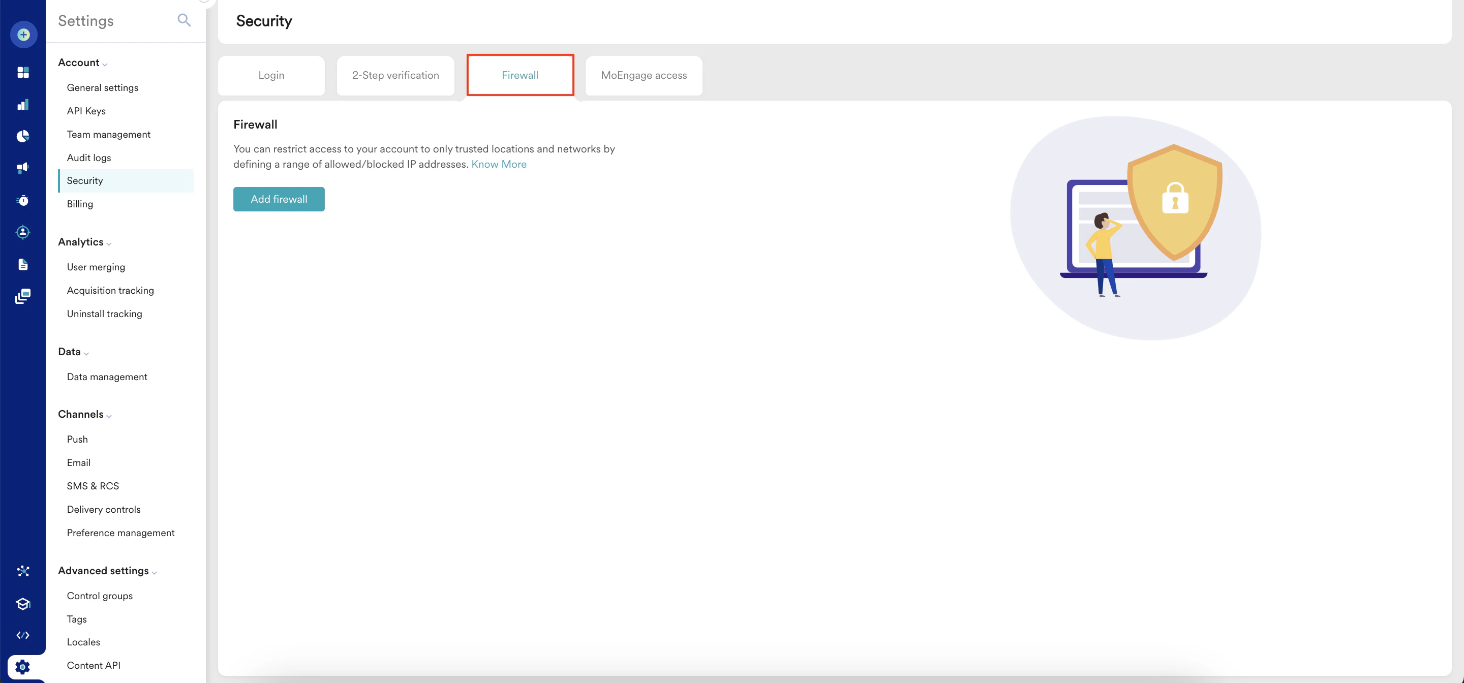 Perform the following steps to add a firewall:- On the left navigation menu in the MoEngage dashboard, click Settings > Account > Security.