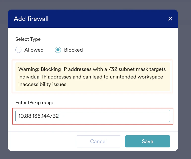 - Blocked: Select this option to blacklist any IP. You can add specific IP addresses or ranges and block their access to the MoEngage dashboard. Connections originating from these IPs are effectively blocked from accessing the MoEngage dashboard. If users attempt to log in from a blocked IP address, their login will fail.