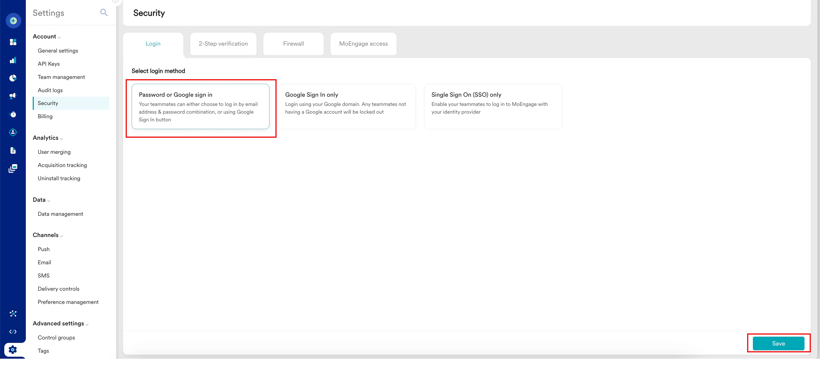 This is the default option. MoEngage allows your team members to log in to the MoEngage account (workspace) using the email address and password combination or using the Sign in with Google button. If you selected any other option and reverted to the Password or Google sign in option, click Save.
