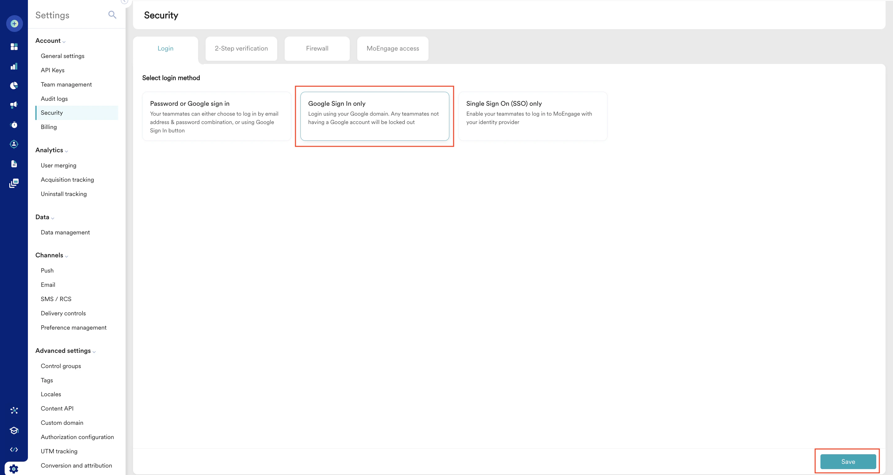 This option limits access to the MoEngage account using Google Sign In only. When you select this option, your team members can no longer access MoEngage using only the email address and password combination. If you want to set up this method, perform the following steps:- On the Login tab, click Google Sign In only.