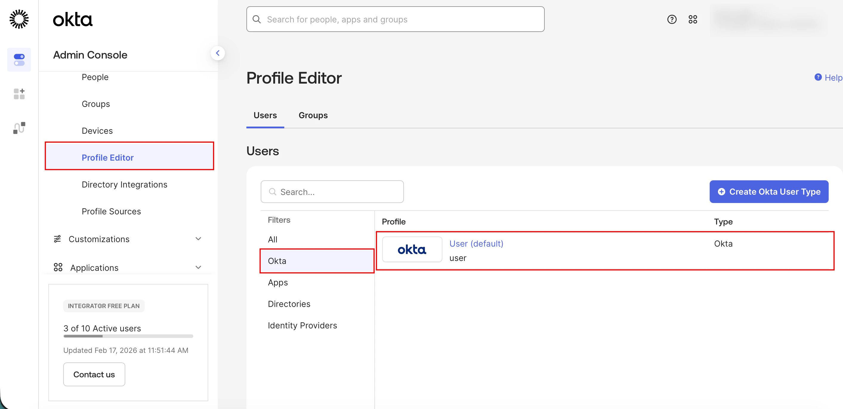 On the Profile Editor page, the All filter is selected by default. - Click the Okta filter and click the Okta User (default) profile.