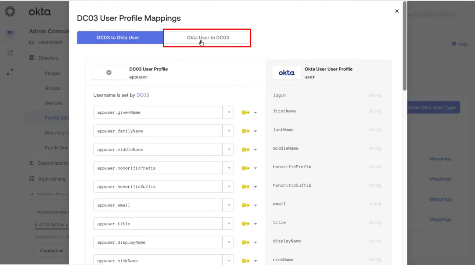 - Select the Okta User to [Your Application Name] (for example, Okta User to DC 03) tab.