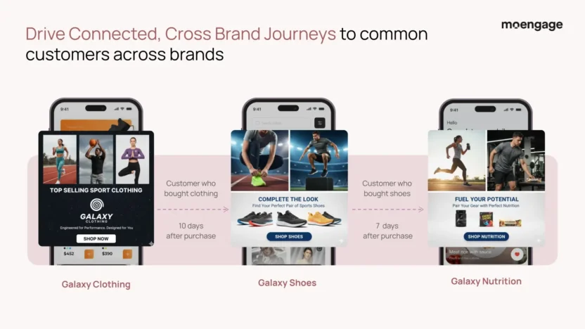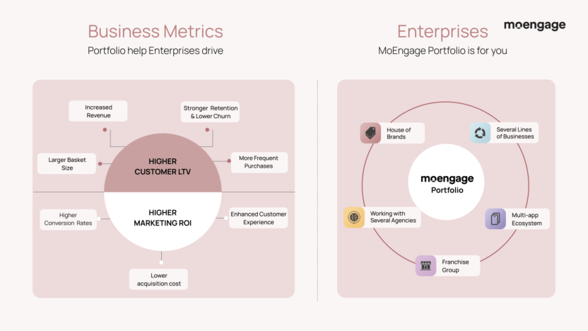 For enterprises that operate as a House of Brands, have several lines of business, multi-apps, work with several agencies, or run multiple franchises, MoEngage Portfolio provides a unified view of the customer and a streamlined approach to drive cross-brand targeting and engagement, helping to drive key business metrics: