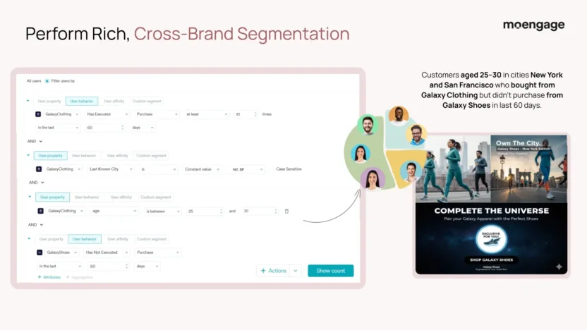 For example, you can create a segment of Customers aged 25–30 in cities New York and San Francisco who bought from Galaxy Clothing but didn’t purchase from Galaxy Shoes in the last 60 days, as shown in the image below.