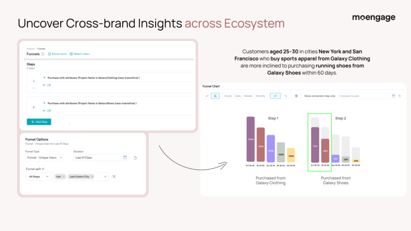 For modern enterprises managing multiple brands, apps, or regional businesses, MoEngage Portfolio is the essential solution to unlock the true value of customer data across the ecosystem. By unifying data, getting a single customer view, uncovering cross-entity insights, targeted segmentation, and powering cross-entity journeys, Portfolio helps brands identify hidden upsell and cross-sell opportunities, driving higher customer lifetime value, increased revenue, and stronger marketing ROI.