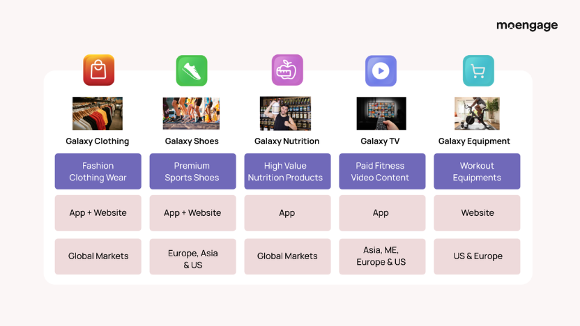 Let’s take the example of a fictitious company, say Galaxy Enterprise, a global sports-focused company with several brands: Galaxy Clothing, Shoes, Nutrition, TV, and Equipment. Each brand has its own app or website and serves varied regions. Each brand manages customer engagement independently.