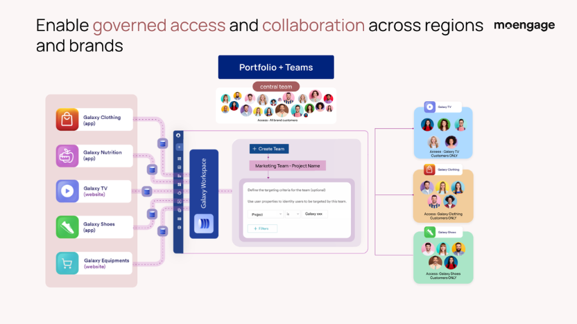 For instance, Team Galaxy Clothing can only access and target users from the clothing brand, and similarly, Team Galaxy Nutrition can only access users from the Nutrition brand. This ensures governed access and collaboration while enduring necessary privacy.
