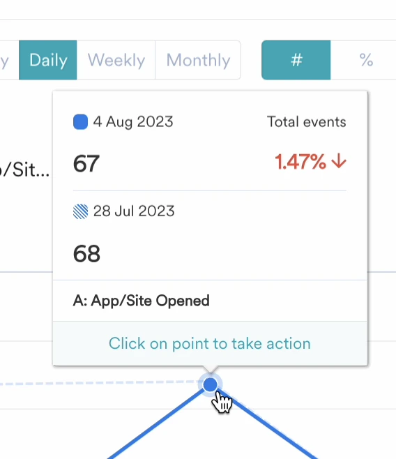 Actionable Analytics can be performed only on the current duration. When analyzing behavior and funnel analysis, simply click on the data point of the current duration line or bar to use actionable analytics. For retention analysis, use the retention table of the current duration and apply actionable analytics.