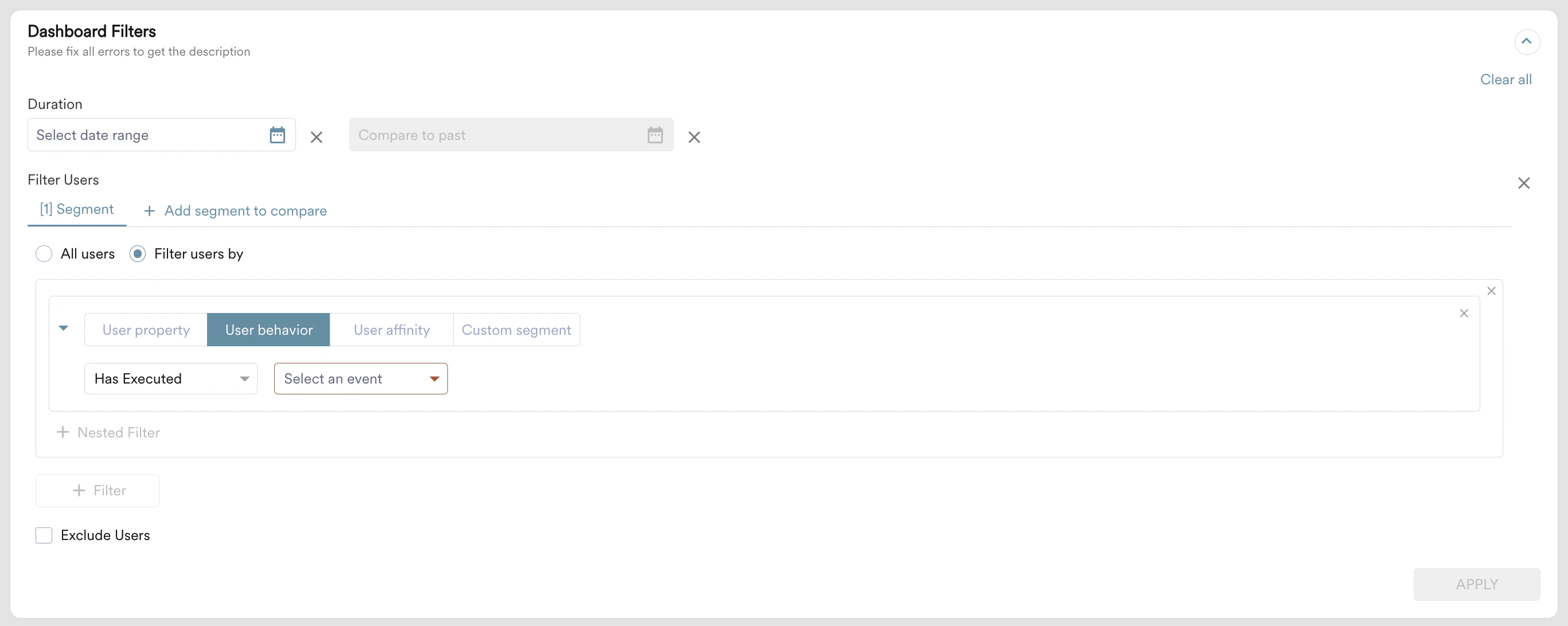 After selecting the events, click on the Add segment to compare in the Filter users section and select the segment based on User Property, User Behavior, User Affinity, or a Custom Segment. You can select up to 5 different segments for comparison at the moment.
