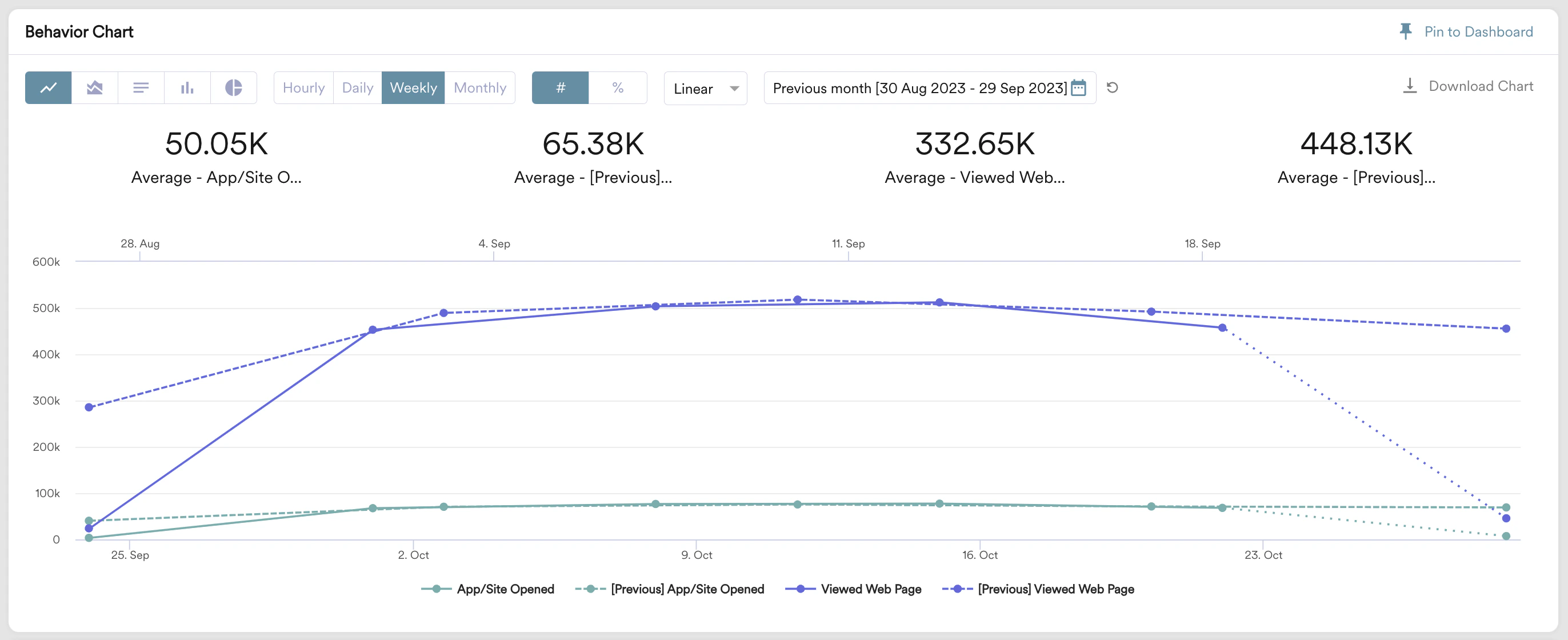 After performing an analysis, click on the Compare to Past button at the top of your chart and select the duration you wish to compare to. You can also select a custom date range starting with or ending with to do a custom comparison equal to the baseline duration.