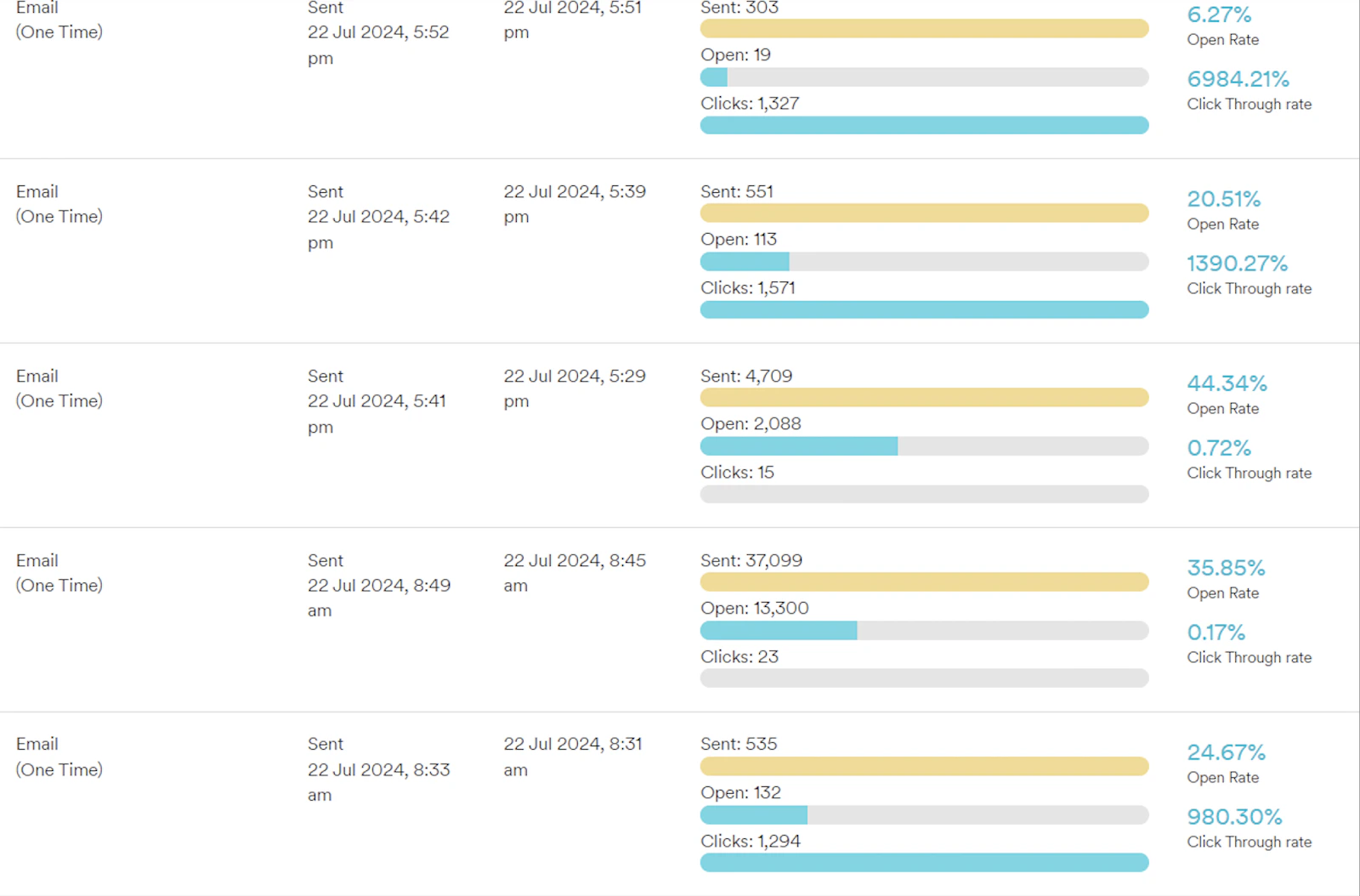The Email campaign click rate displays a higher value than the open rate in certain campaigns.