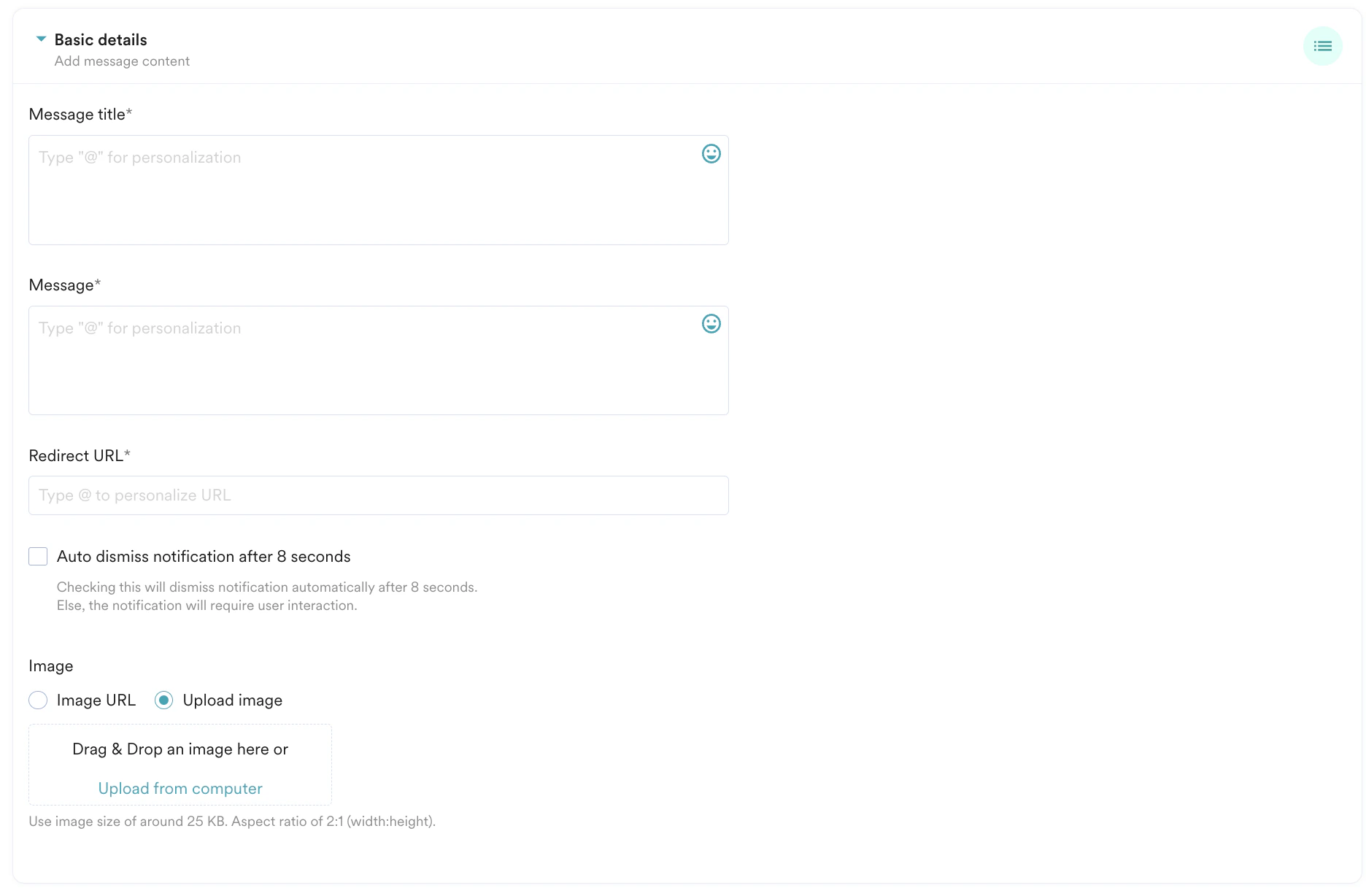 5. Image: This is the image that is attached below the message of the notification. You can either upload an image from your computer or enter a URL for your image.