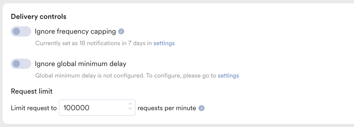 • Request Limit - We support a maximum throughput of 250K requests per minute. If multiple campaigns are running in parallel, then we might not be able to support throughput for all the campaigns and campaigns might be delayed