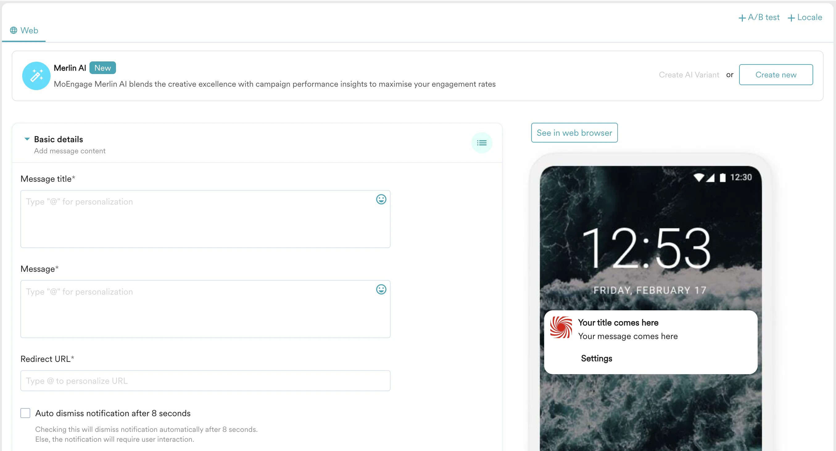 4. Auto Dismiss Notification: You have the option to dismiss the notification automatically after 8 seconds. If you do not enable this option, the user will see the notification until they have interacted with it (either removed or opened it).