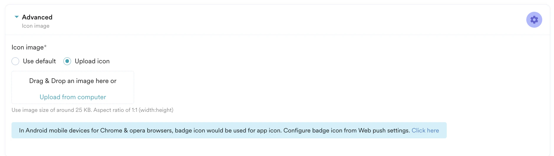 Icon Image: This is the icon displayed in the push message. You can either select the default icon (present in Web Push settings) or upload a new image.