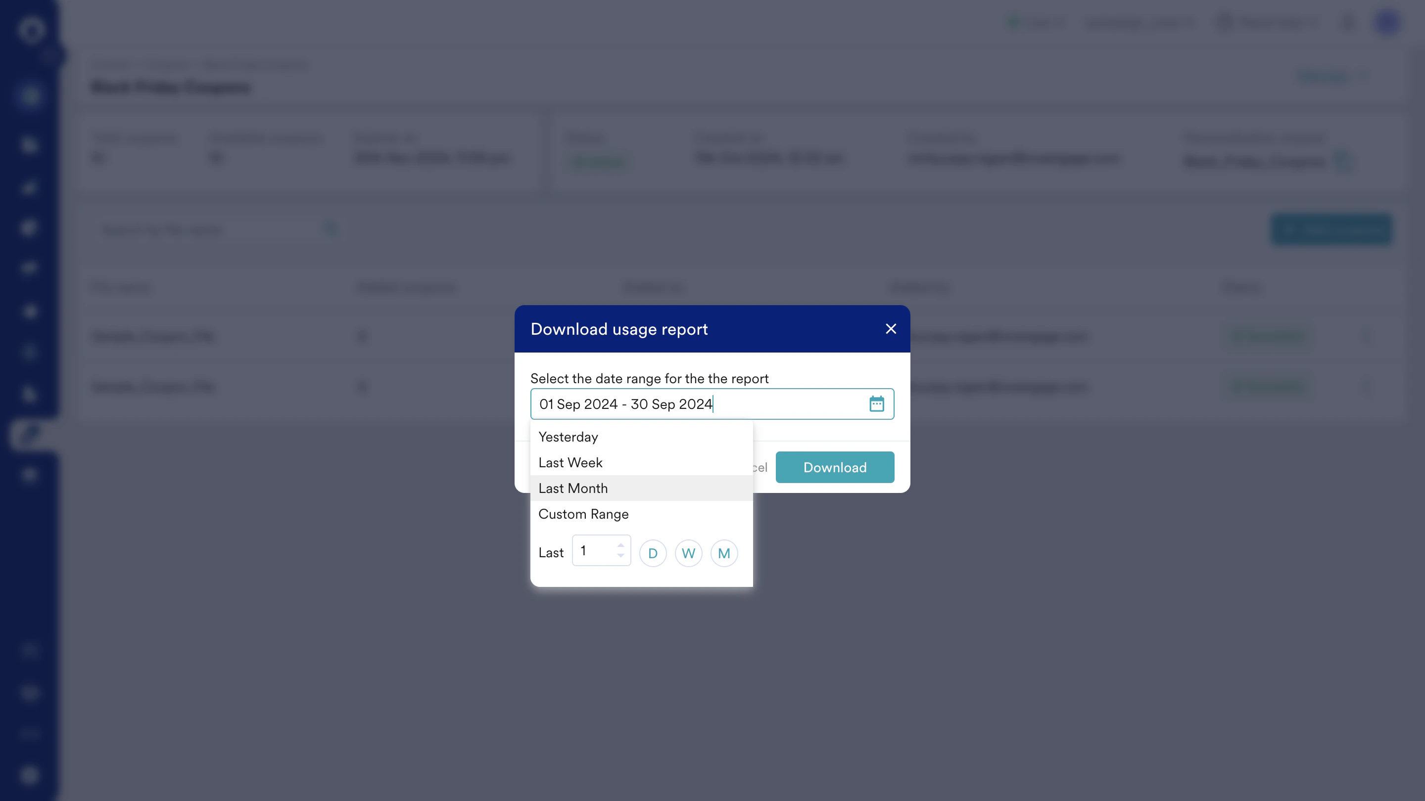 - On the Download usage report dialog box, select the desired date range for which you wish to export the coupon distribution report.