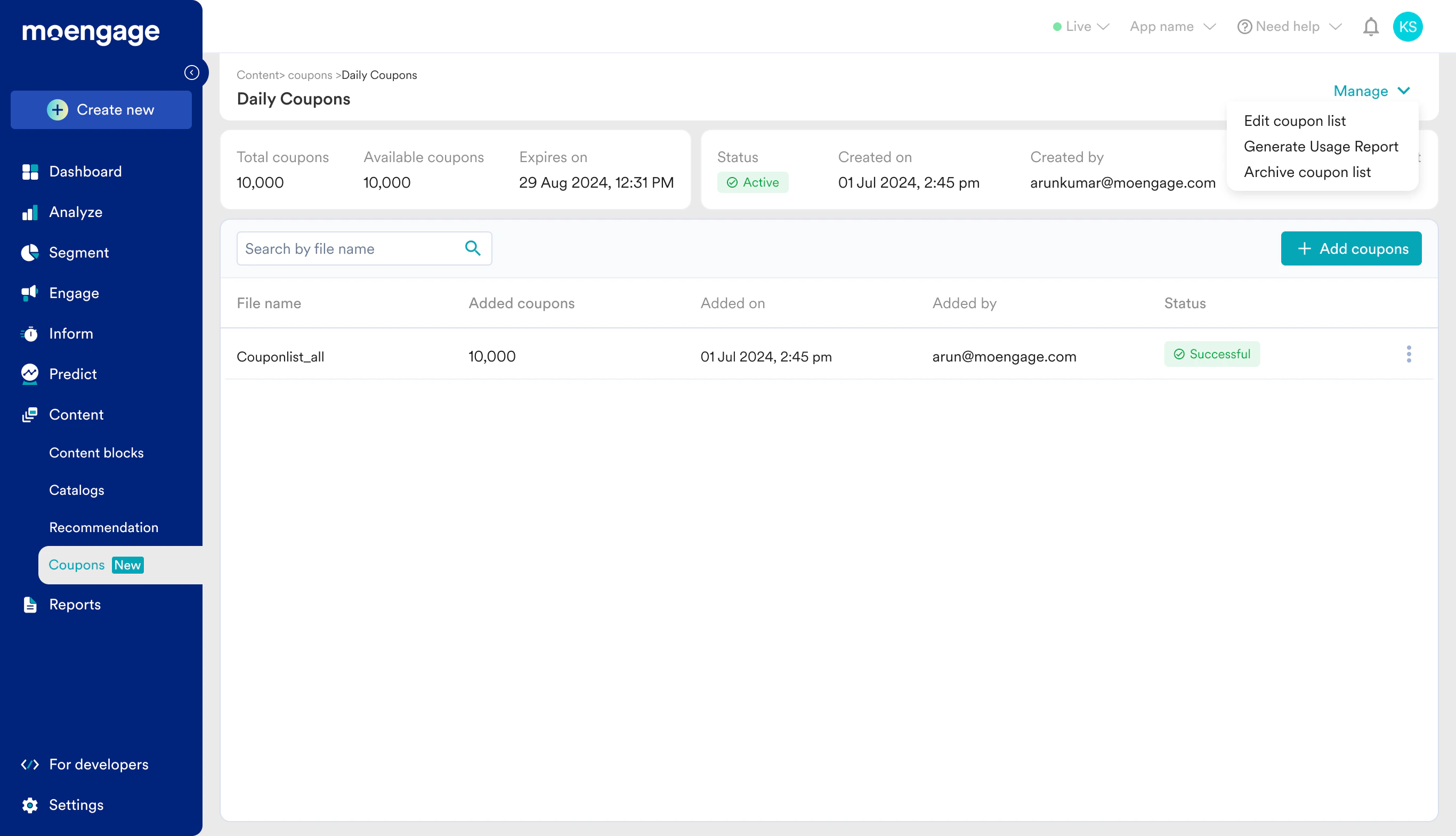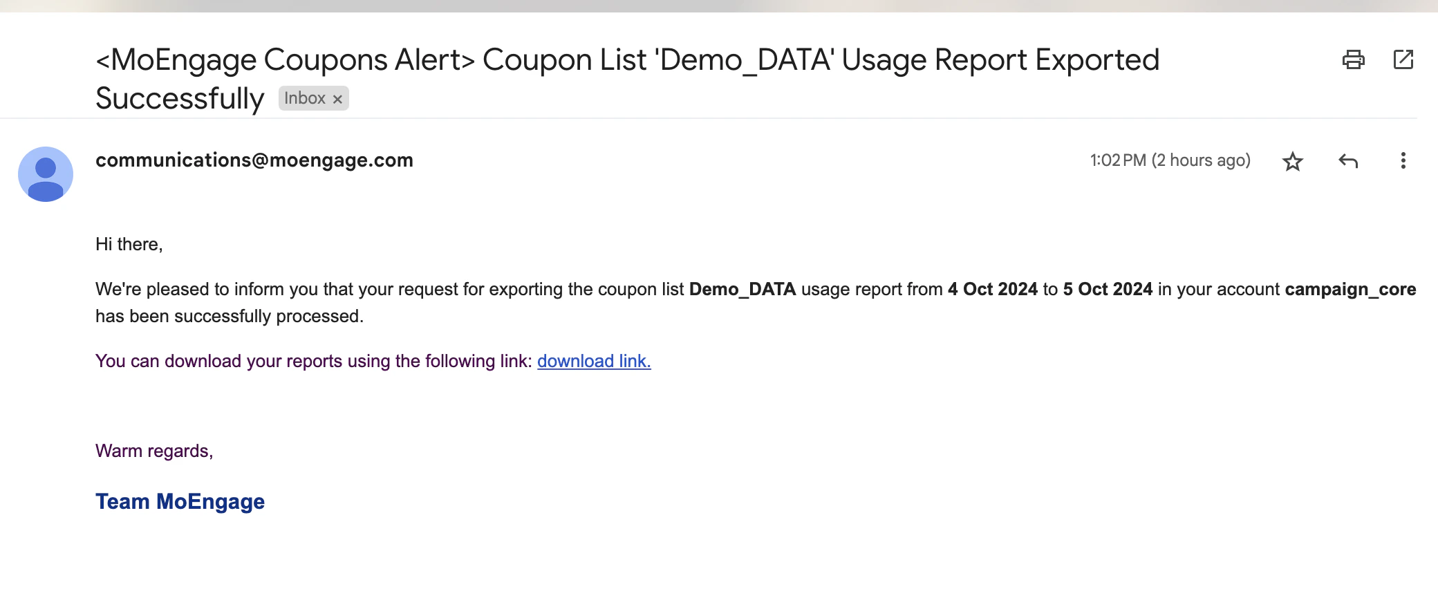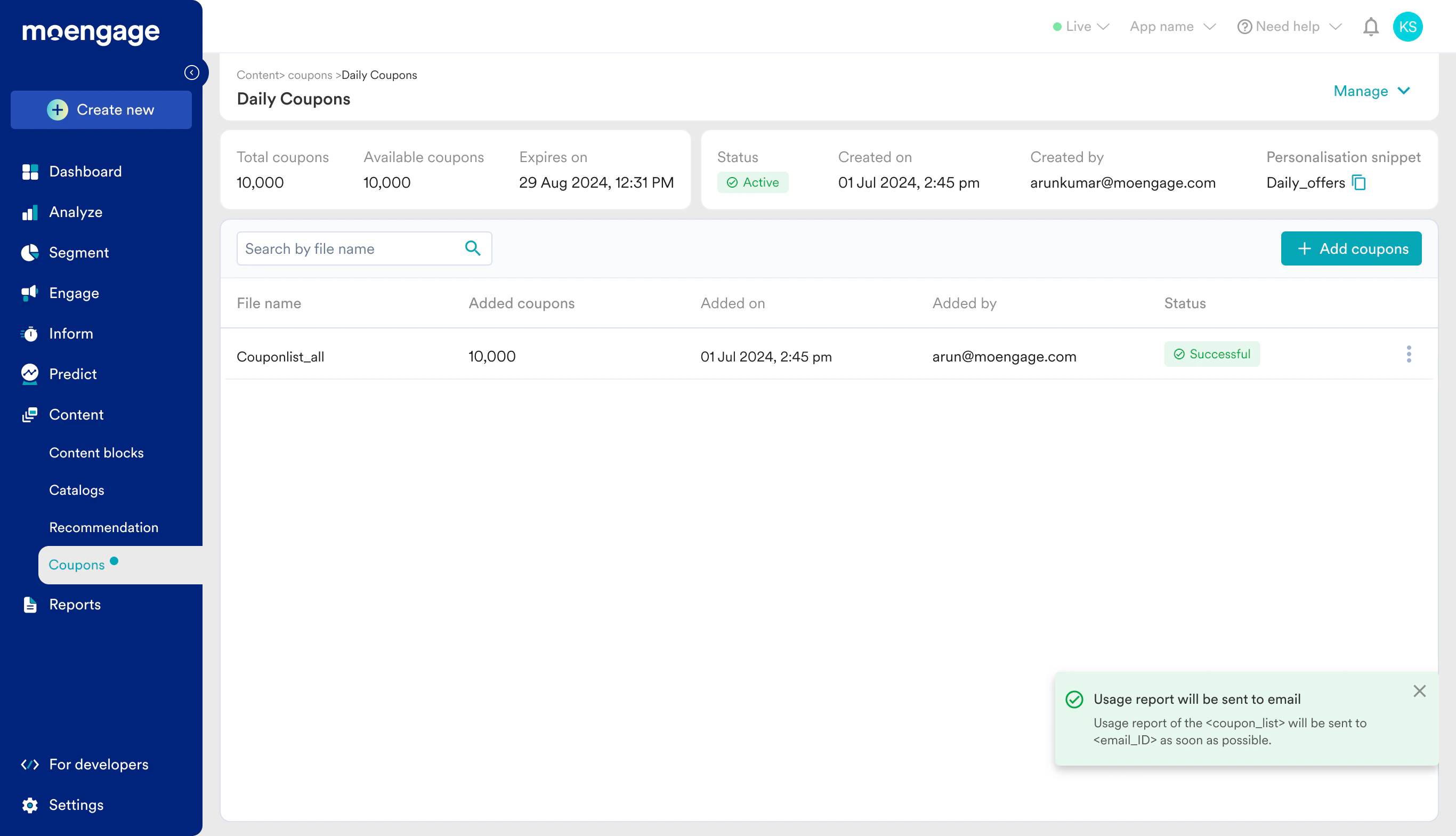MoEngage does not verify the redemption of coupon codes. You can generate the audit report of the coupon list used by different campaigns. For more information, refer to a sample usage report.- Click the vertical ellipsis icon next to a coupon list, and then click Generate usage report.
