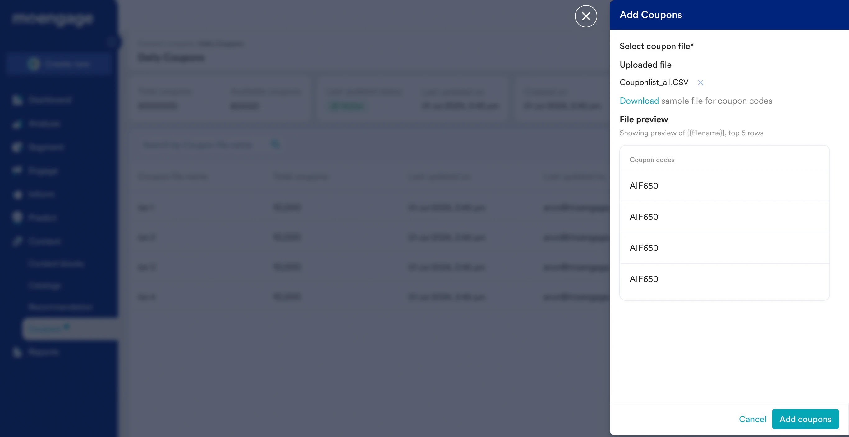 - Coupon files: You can add coupons to an existing Coupon list by importing a coupon file. You can upload a coupon file directly from the dashboard or automate the task through the Coupons API for a more efficient and streamlined import process. This feature ensures your coupon lists are consistently updated and ready for deployment in your marketing campaigns.
