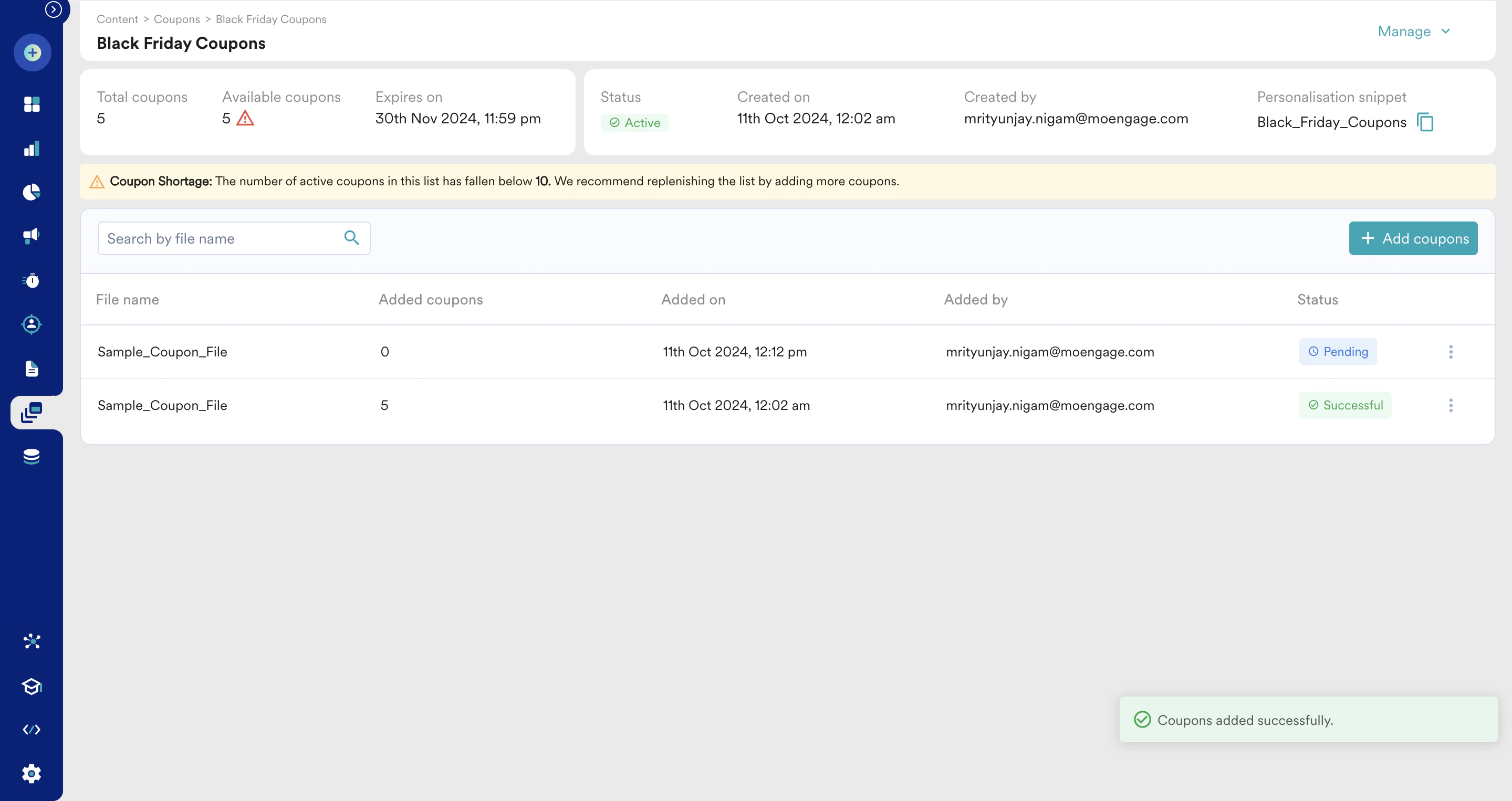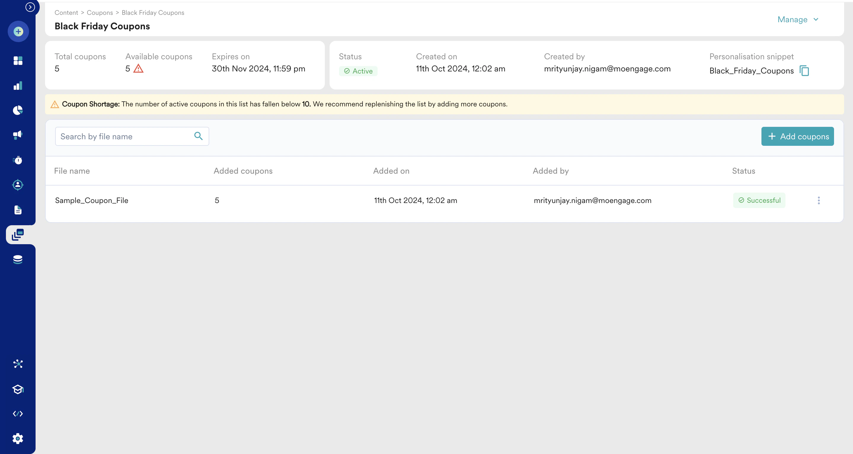 On the Coupons page, you can create, manage, and track your coupon lists for your marketing campaigns and flows. To ensure coupon availability for campaigns, you can add more coupons to a coupon list proactively:- Coupon lists: This is the repository of one type of all coupons stored within the system. It contains only the single-use coupon code for each coupon. These lists serve as the foundation for all coupon-related operations. MoEngage allows you to create multiple coupon lists, enabling you to maintain distinct lists for different types of codes or various campaigns.