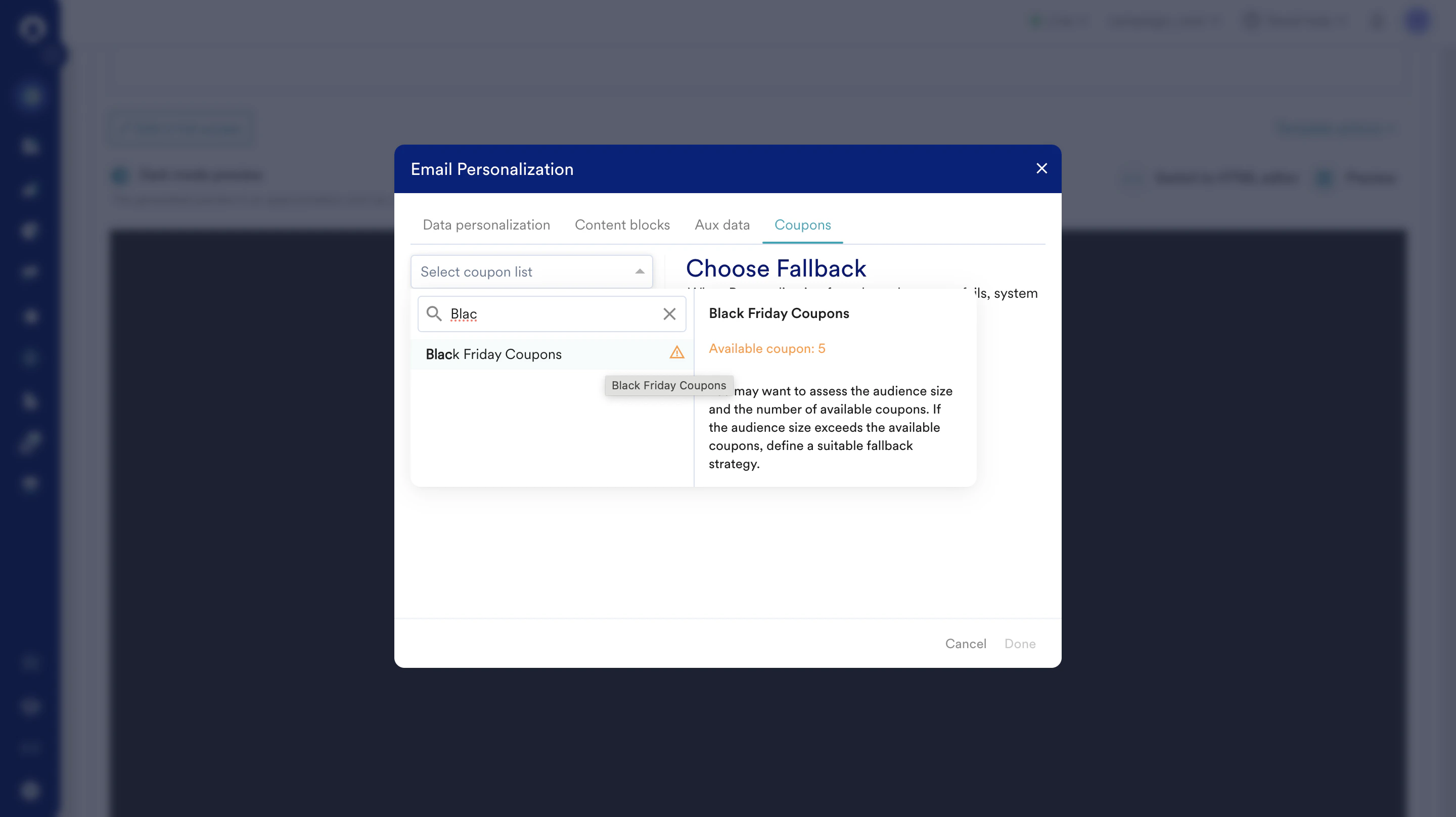 - Select the coupon list and choose a fallback to define what happens if the coupon list doesn’t retrieve coupons. Selecting Do not send Email will stop any email from being delivered without the coupon code. You can also use a static fallback coupon code as an alternative.