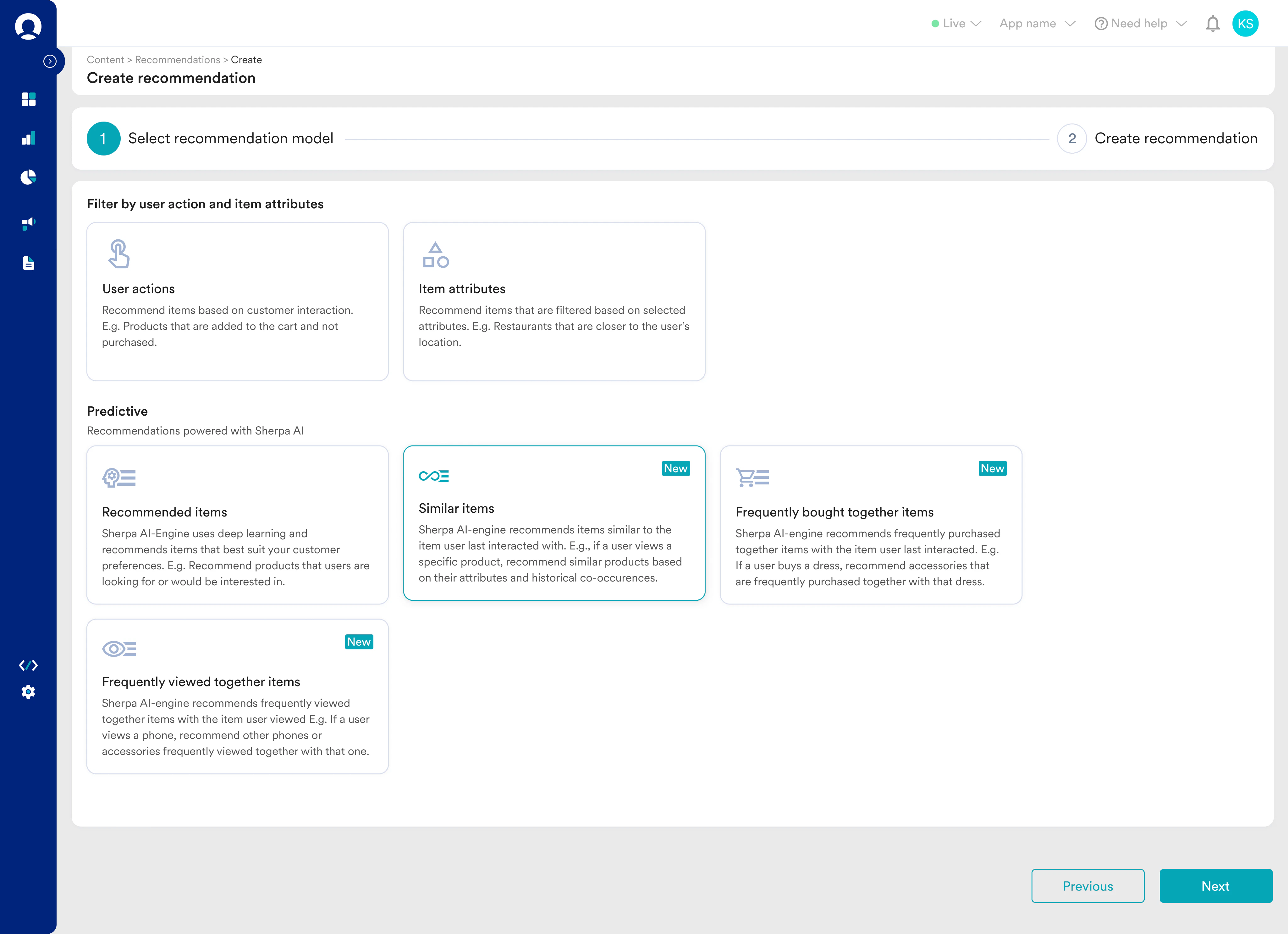 Note: All AI recommendations consider one catalog. After you use a catalog in any AI recommendations, it will be automatically configured for all other types of AI recommendations. - Choose the relevant user actions based on your use case from the drop-down list.
